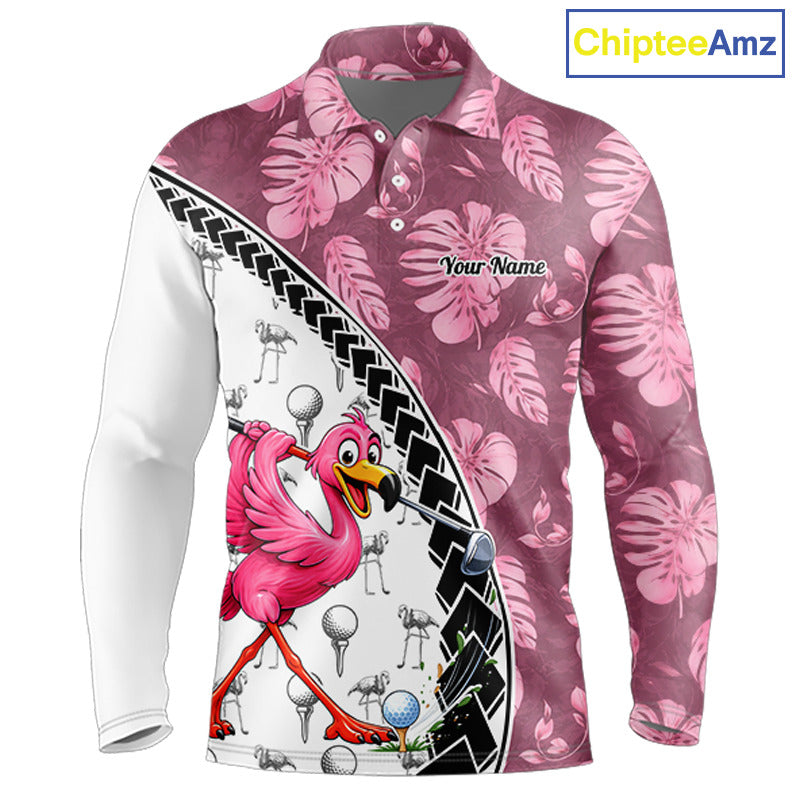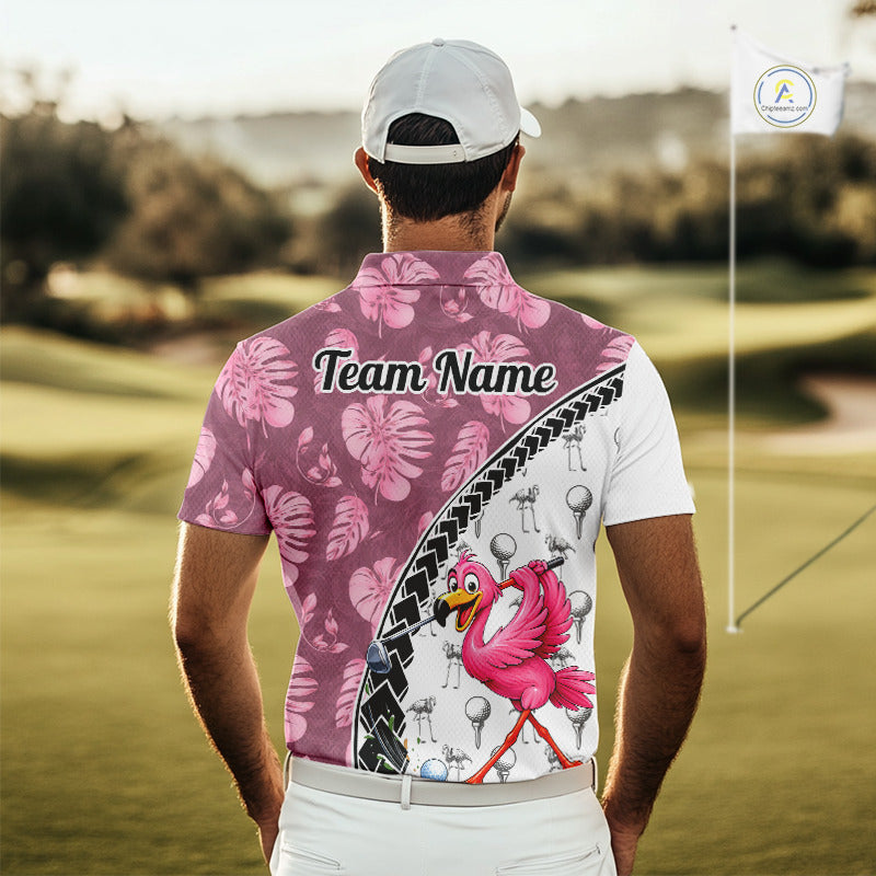 Golfing Flamingo Mens Golf Polo Shirt Custom Pink Pattern Monstera Golf Ball Clothes Shirts NYN2910