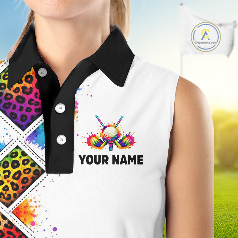 Rainbow Womens Sleeveless Golf Polo Shirt Leopard Print Pattern Custom Team Ladies Golf Top, Golf Gift NHN0228