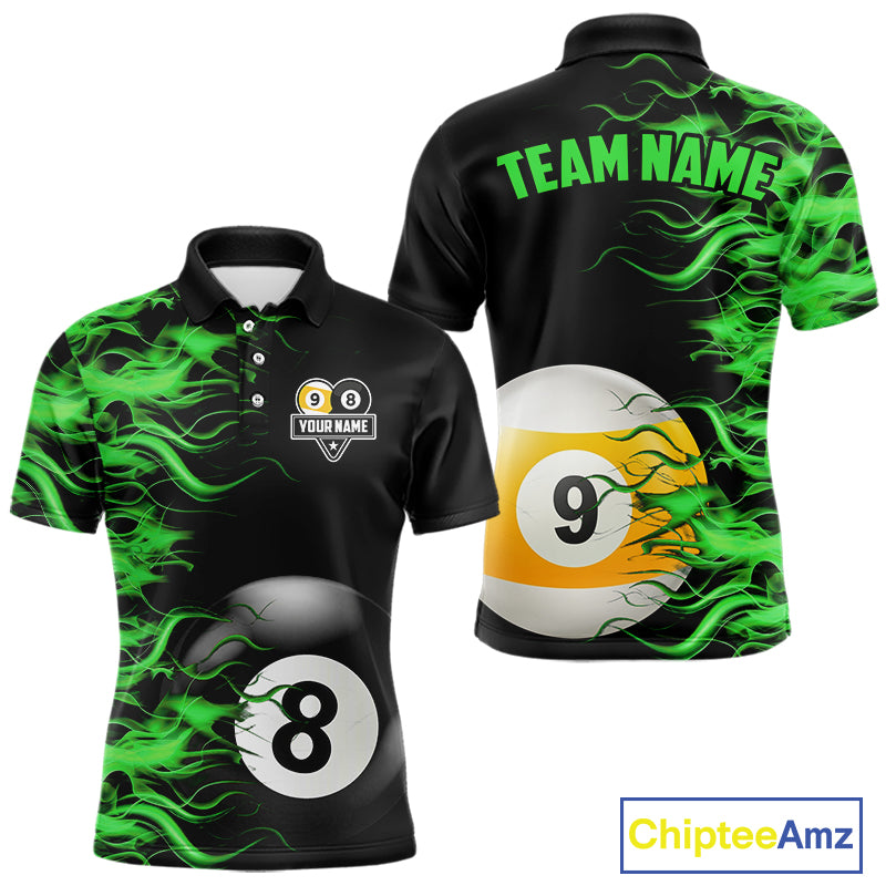 Green Flaming 8 Ball & 9 Ball Billiard Shirt For Men Custom Pool Team Jersey Polo & 1/4 Zip TDM5482
