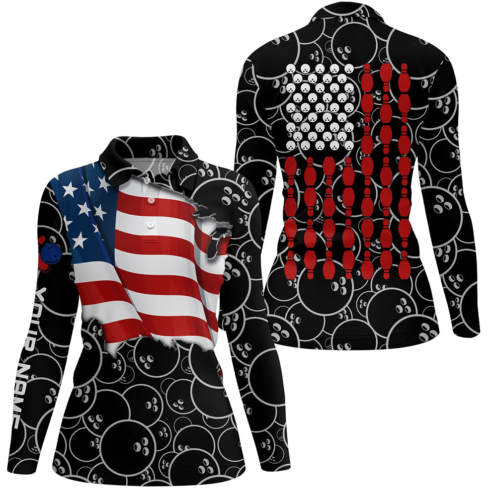 American Flag black camo Bowling Shirt for Women Custom Polo, Quarter Zip shirt, Team Patriots Bowlers NQS7705