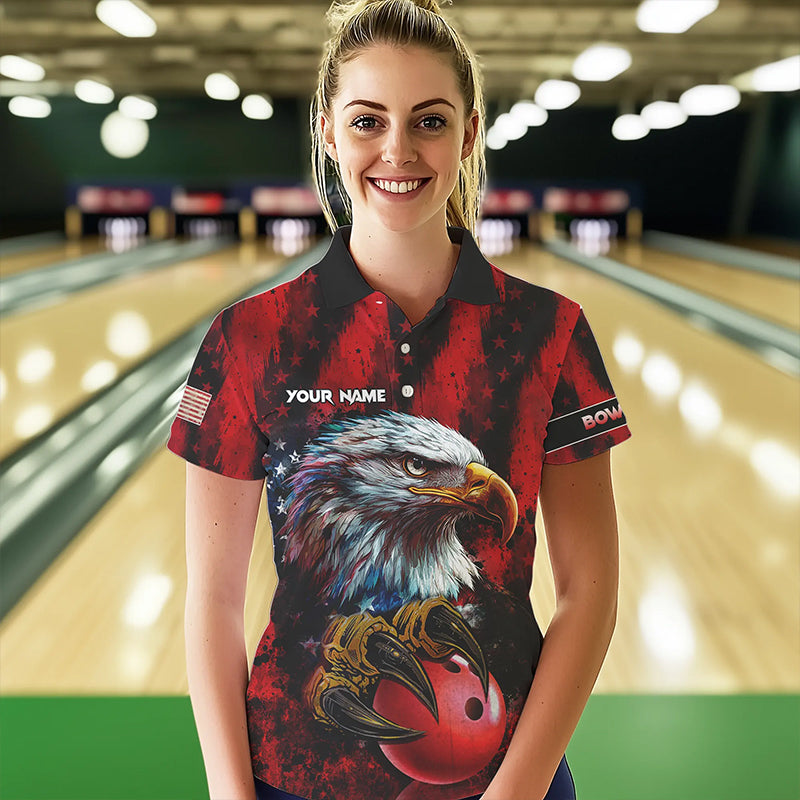 American Flag Eagle Bowling Polo, 1/4 Zip Shirts For Women Custom Name Patriotic Bowling Team Jersey NQS9660