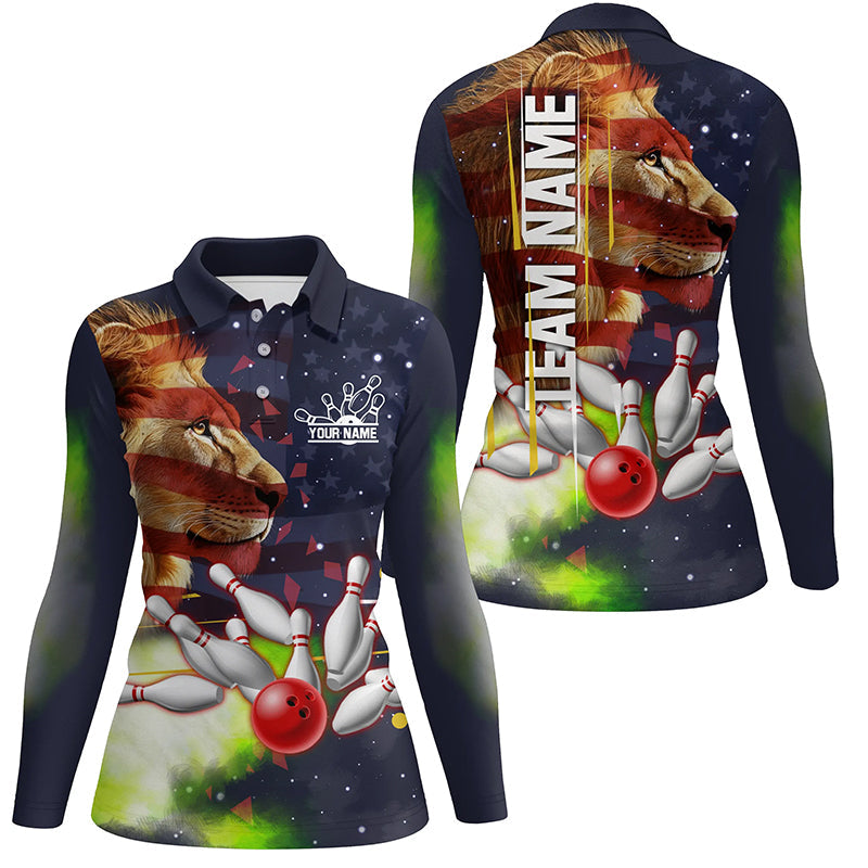 American flag Lion Bowling Polo, Quarter Zip Shirt For Women Custom Patriotic Bowling Team Jerseys NQS8565
