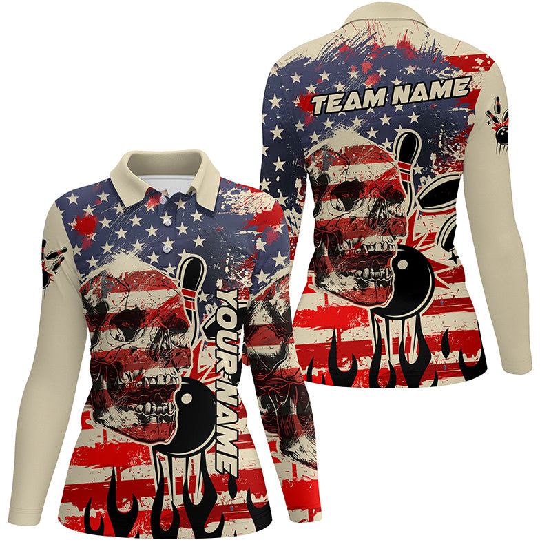 American flag skull bowling polo shirts for women Custom Team ladies bowling jerseys, gift for bowlers NQS7305