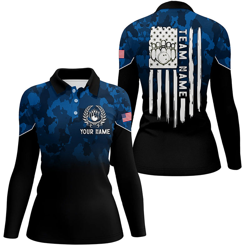 Black blue camo Women bowling polo shirts Custom American flag patriotic bowling team league jerseys NQS6523