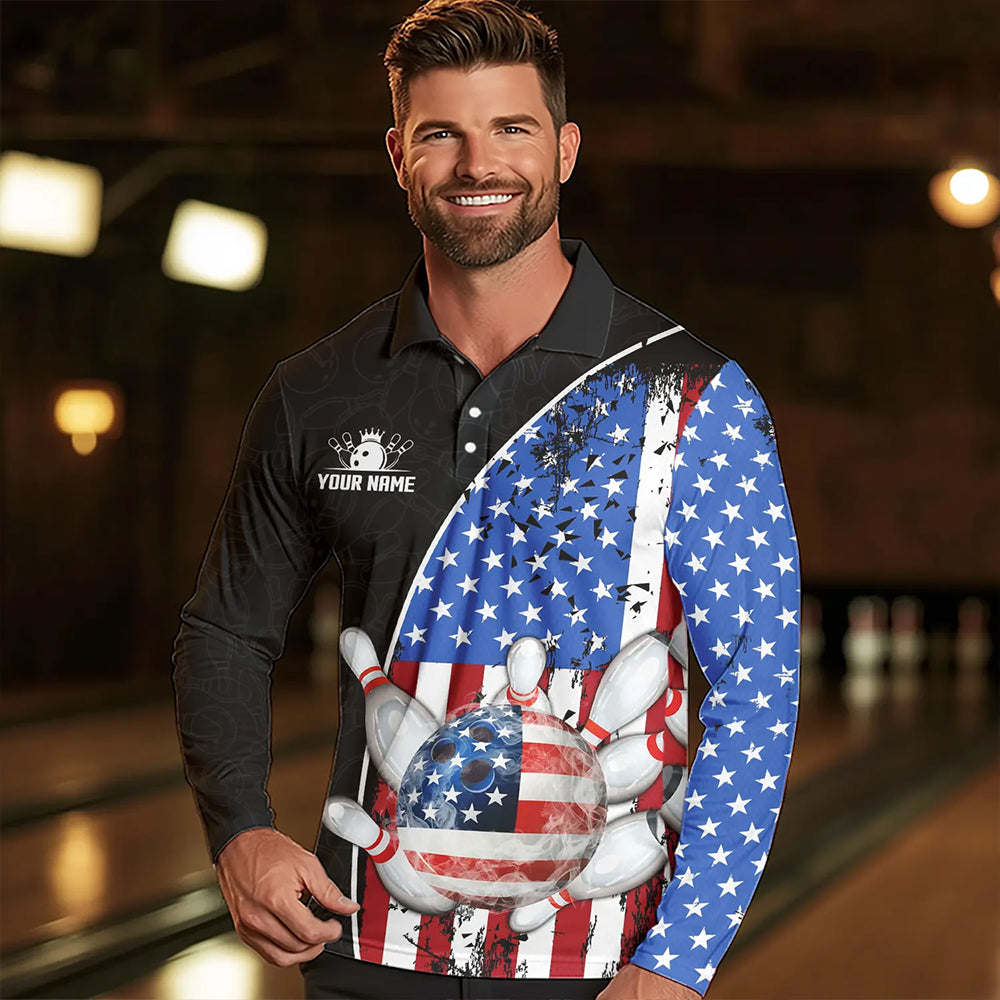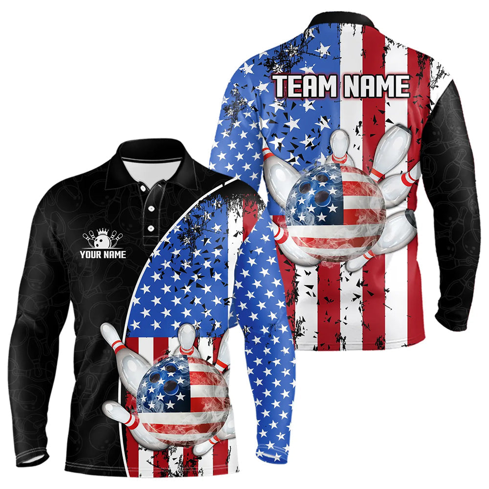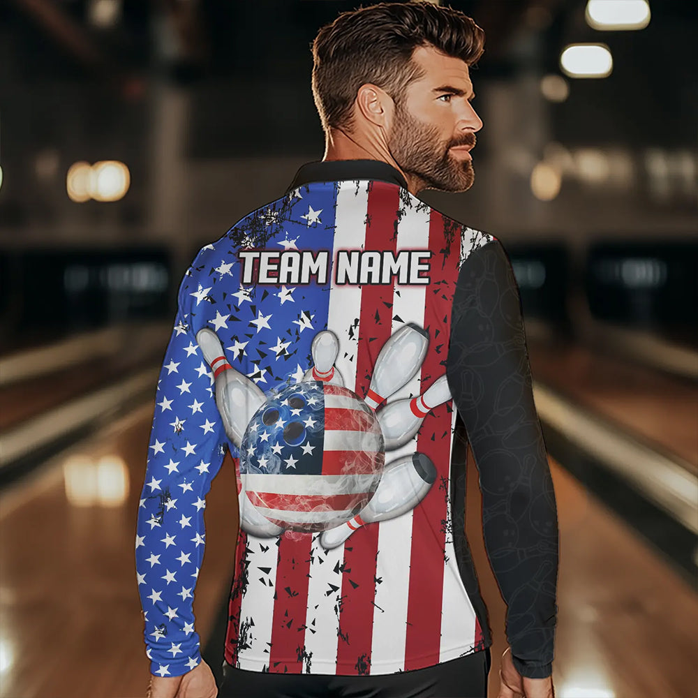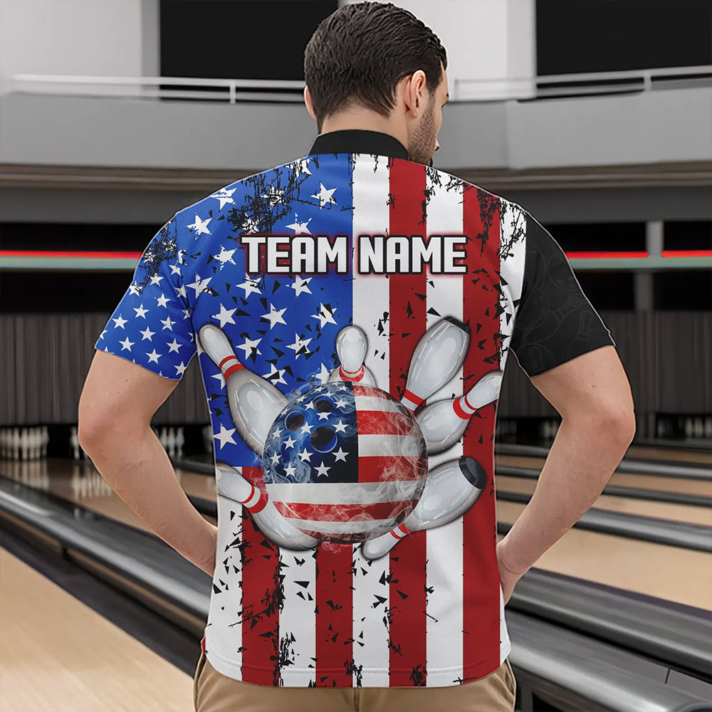 Black Camo Bowling Polo, 1/4 Zip Shirts For Men Custom American Flag Patriotic Bowling Team Jersey NQS9640