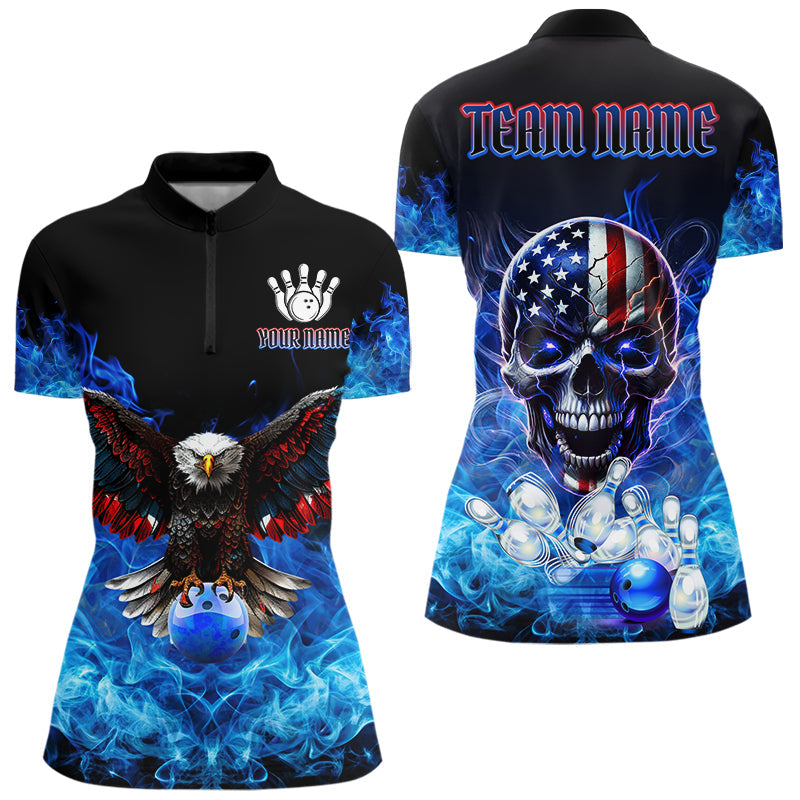 Blue Flame Smoke American Flag Eagle Skull Women Bowling Shirts Custom Patriotic Bowling Team Jersey NQS9659