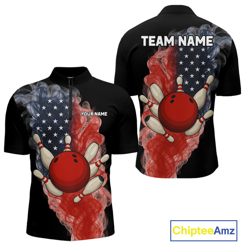 Custom Smoke American Flag Black Bowling Shirts for Men Personalized Patriotic Team Bowling Jerseys NQS10496