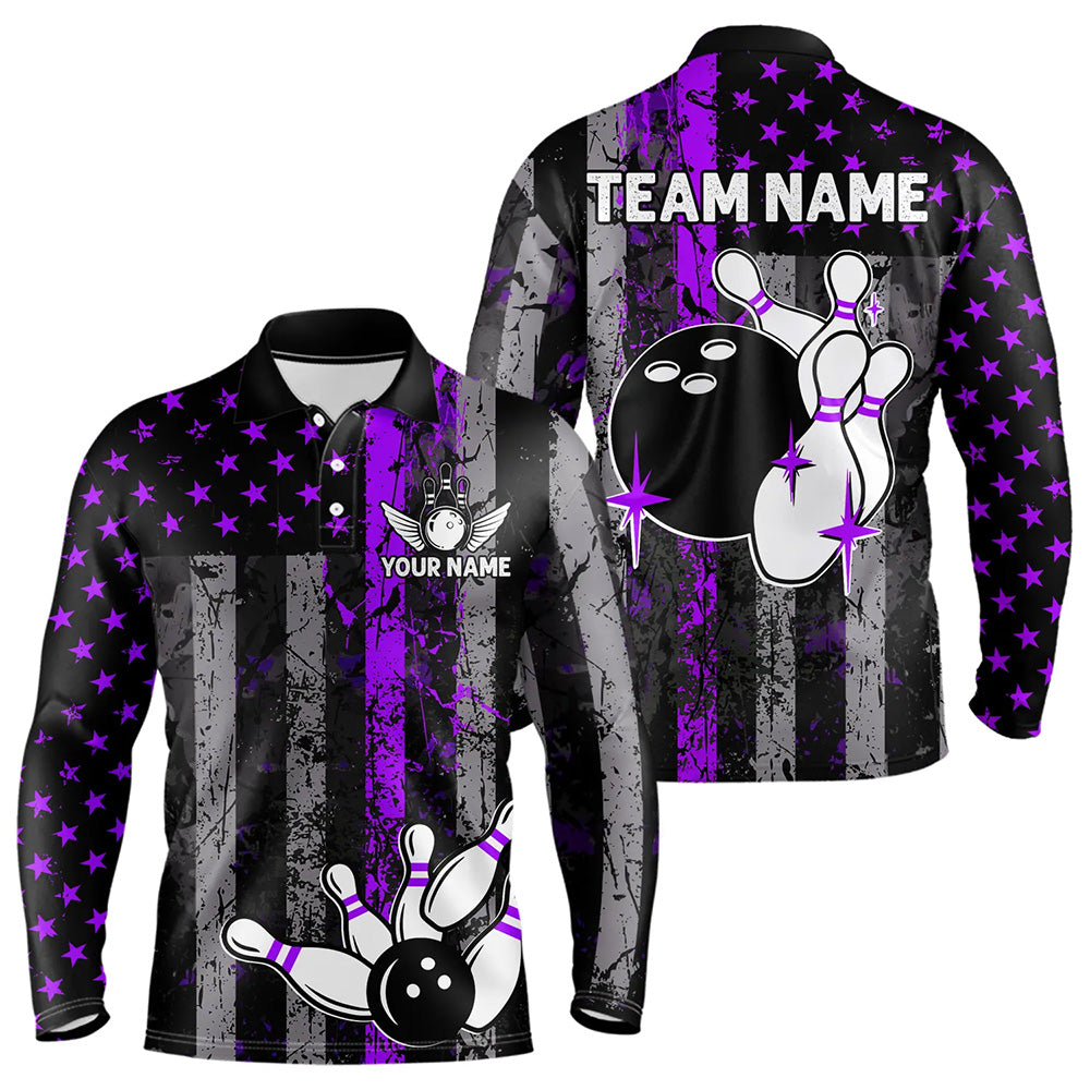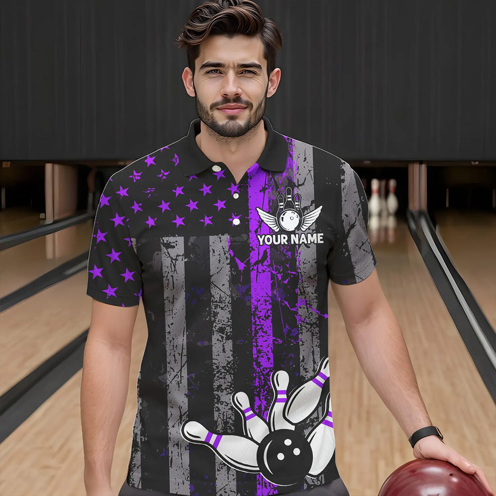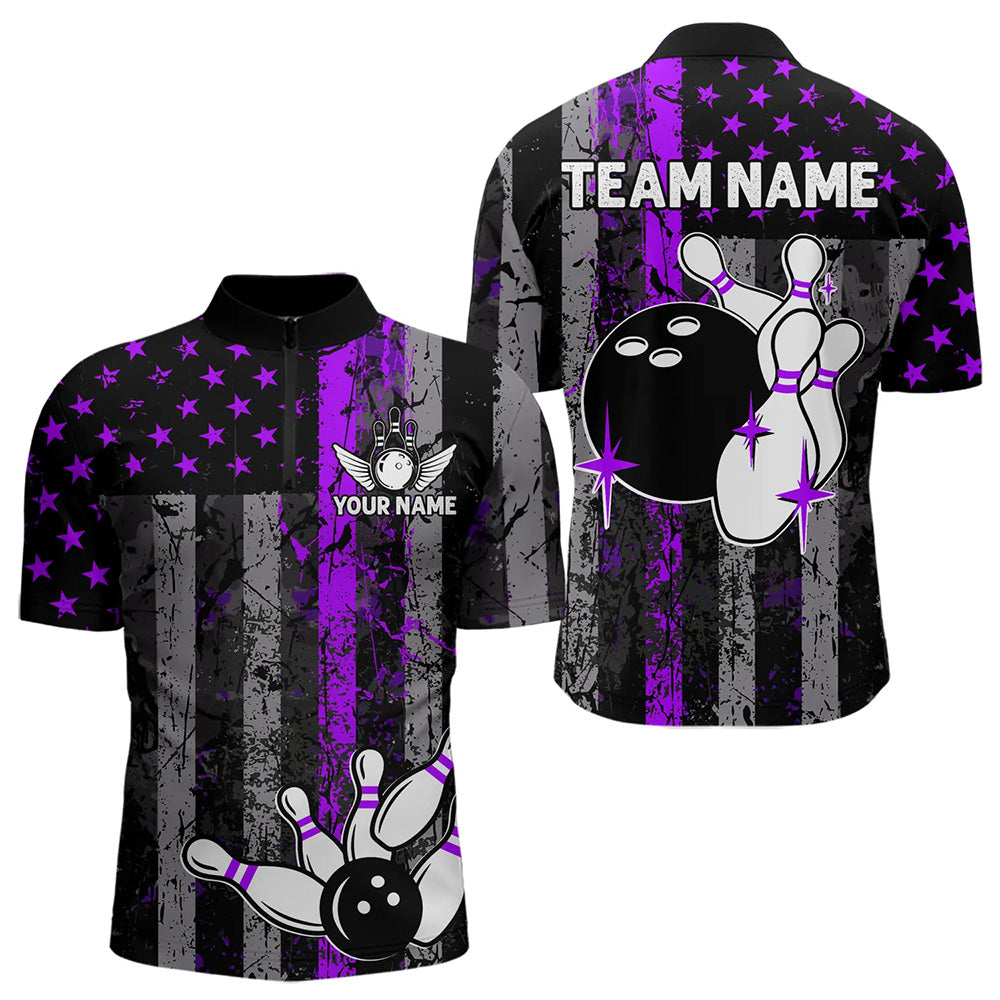 Purple And Black Grunge American Flag Patriotic Bowling Shirts For Men Custom Bowling Team Jerseys TDM3697