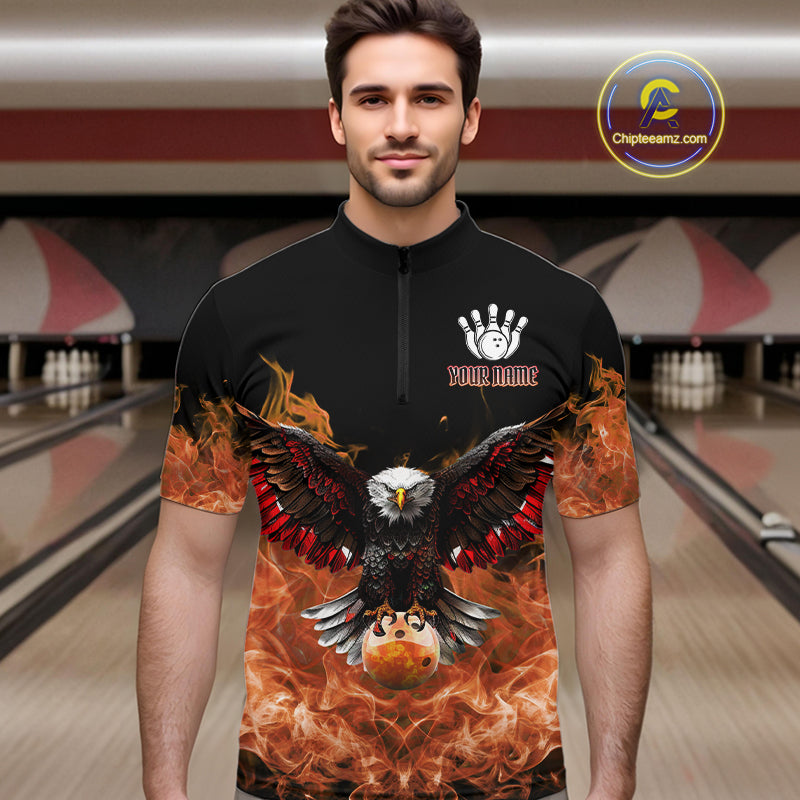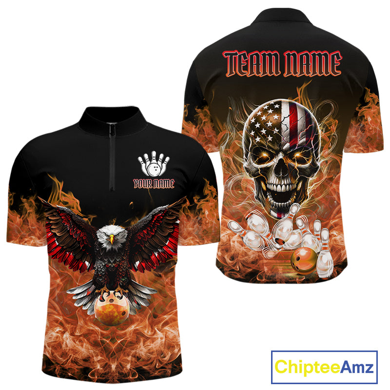Orange Flame Smoke American Flag Eagle Skull Mens Bowling Shirts Custom Patriotic Bowling Team Jersey NQS10526