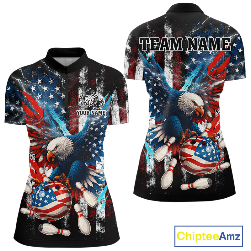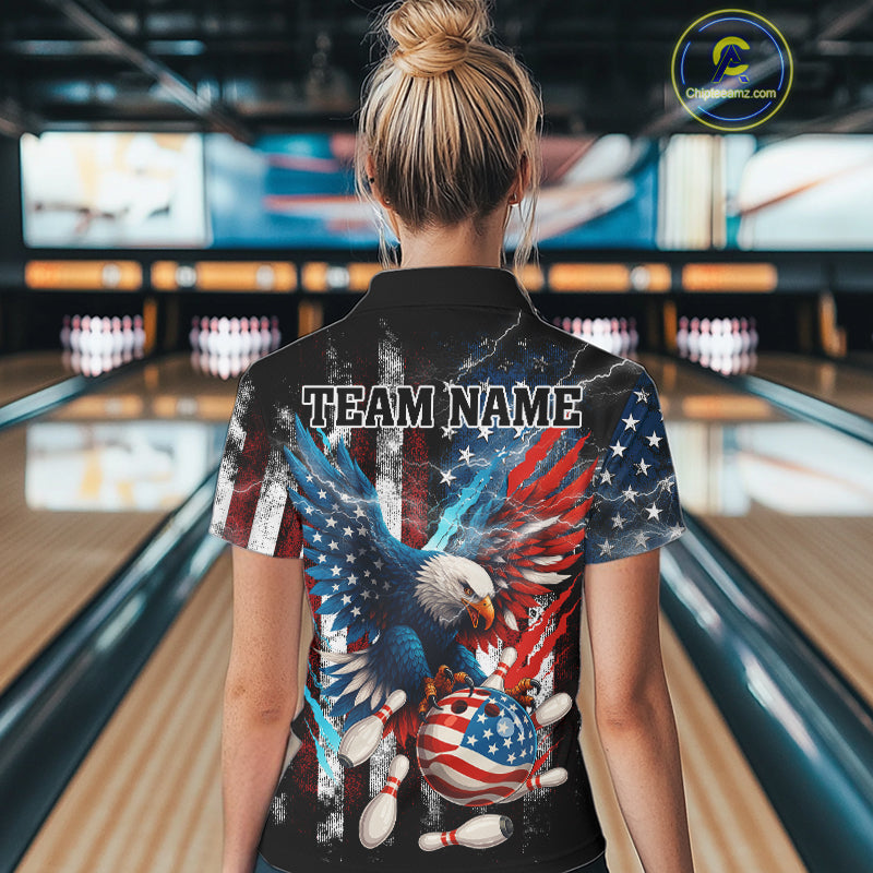 Personalized American Flag Eagle Lightning Thunder Women Bowling Team Shirts, Patriotic Bowling Gift NQS10834