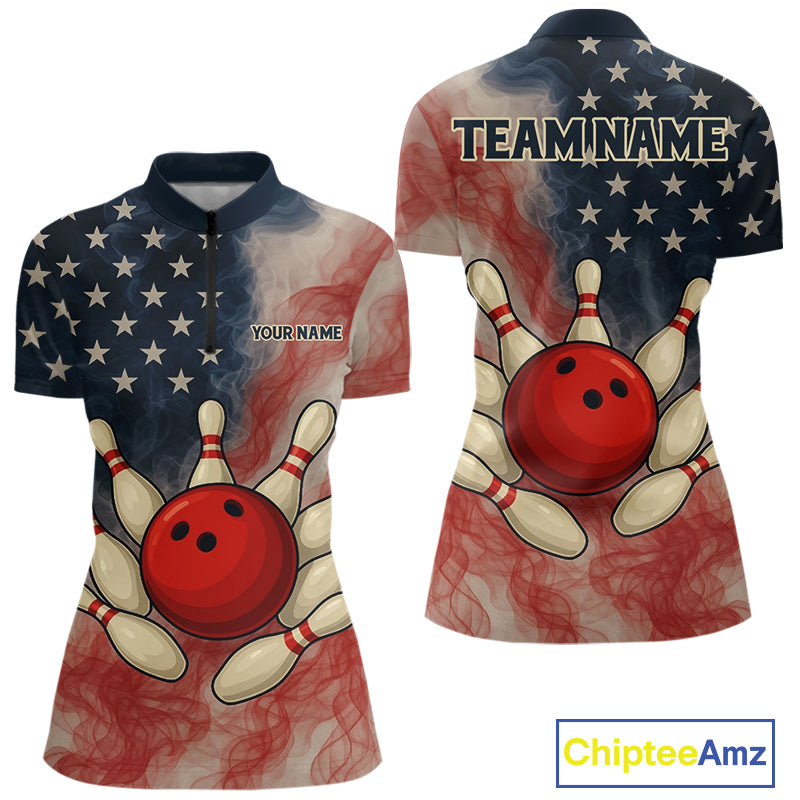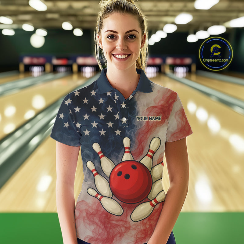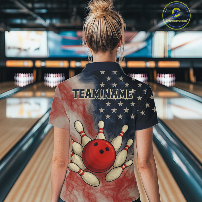 Personalized Smoke American Flag Bowling Shirts for Women Custom Patriotic Team Bowling Outfits NQS10498