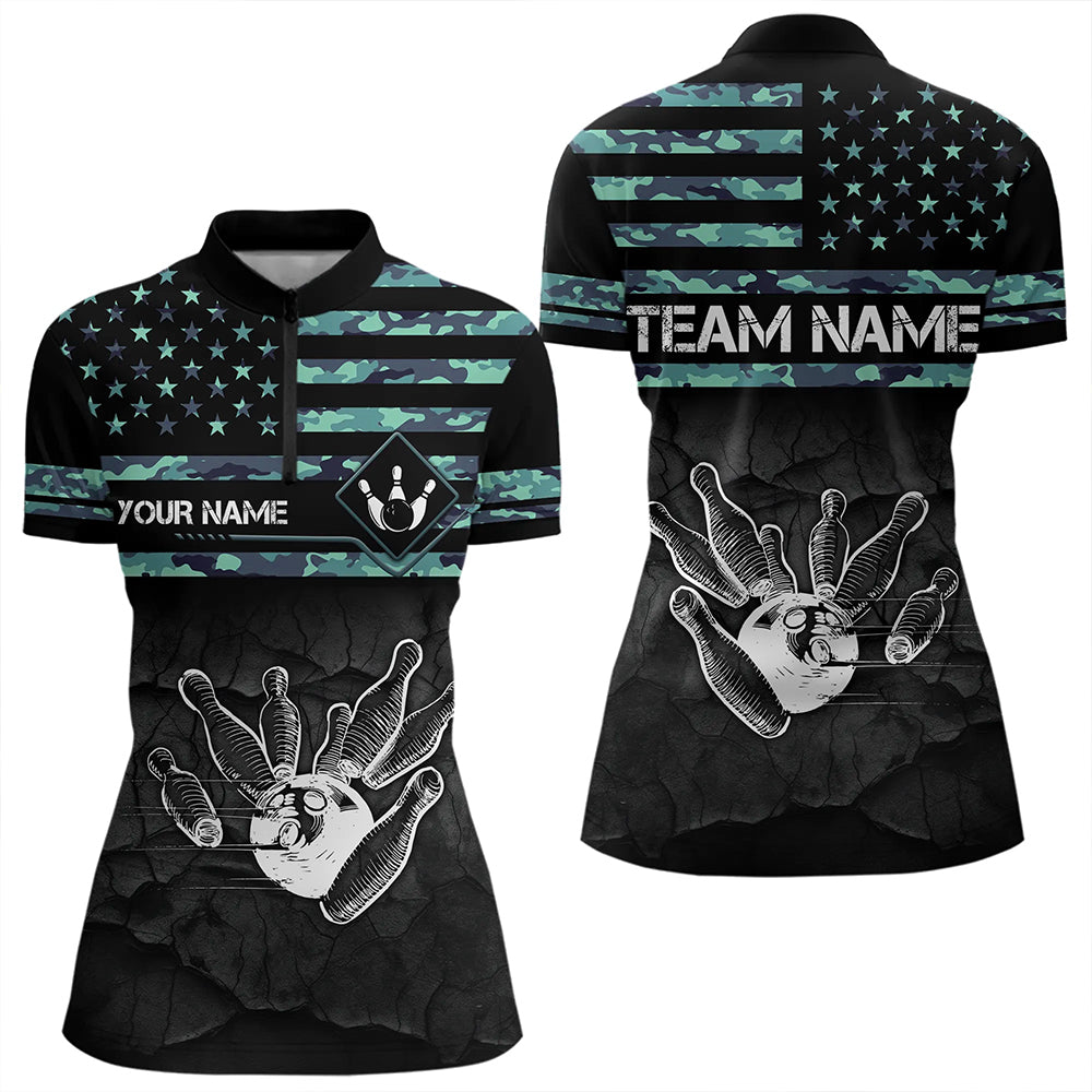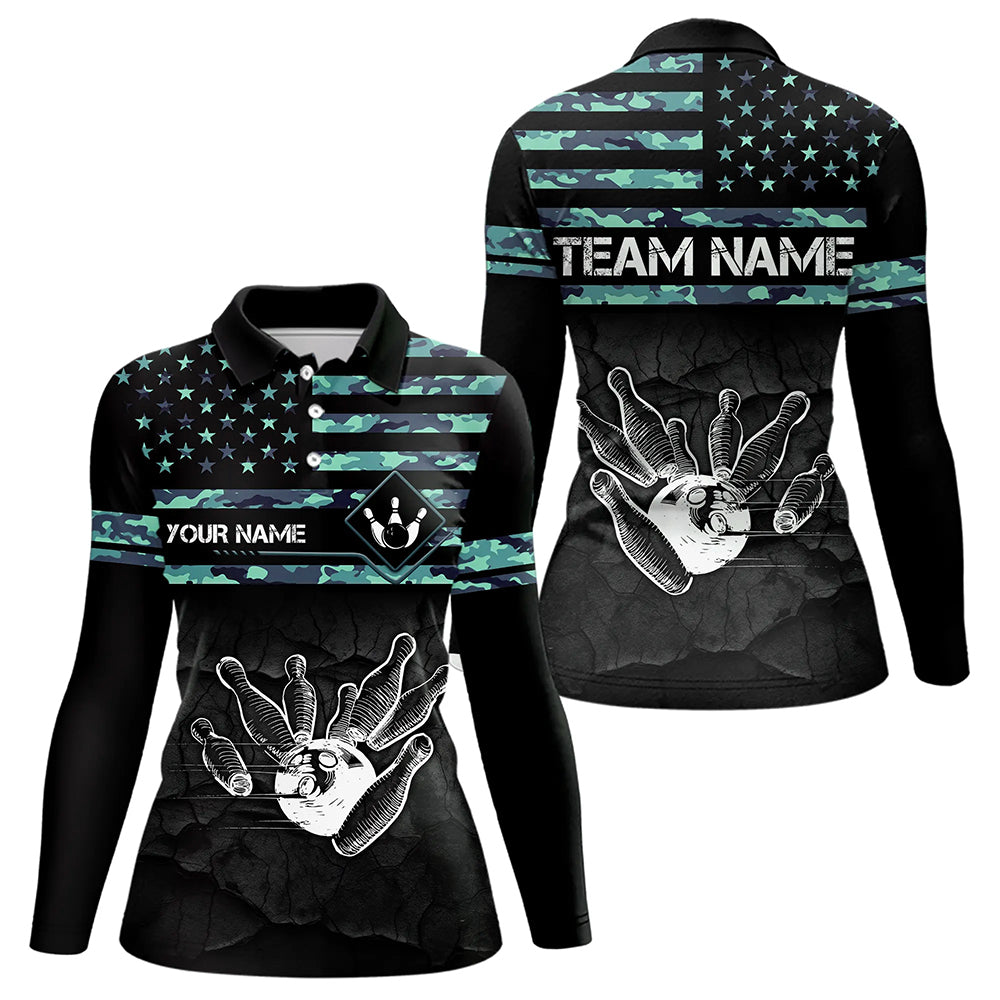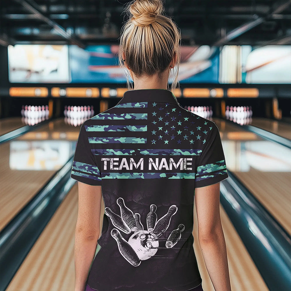Personalized Turquoise camo American flag Custom Bowling Team Shirts For Women, Bowling League Jersey NQS9725