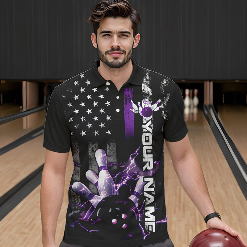 Custom Black And Purple Thin Line American Flag Patriotic US Bowling Team Polo Shirts For Men IPHW8517