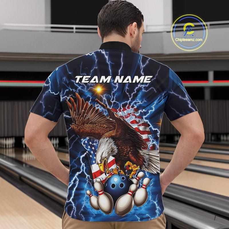 Custom Blue Lightning US Flag Eagle Bowling Team Quarter-Zip Shirts For Men, Patriotic Bowling IPHW9477