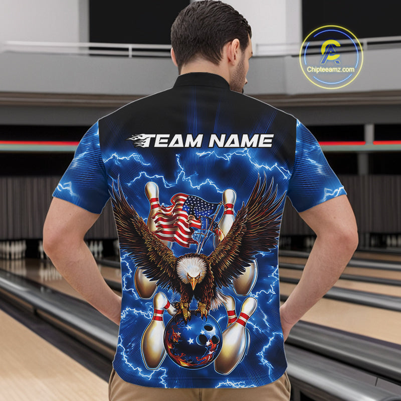 Custom Blue Lightning US Flag Eagle Bowling Team Quarter-Zip Shirts For Men, Patriotic Bowling IPHW9479