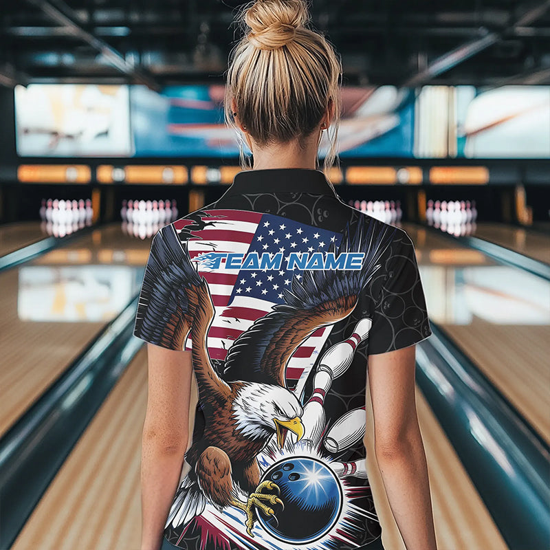 Custom American Flag Eagle Bowling Team Women Quarter-Zip Shirts, US Bowling League Shirt IPHW8752