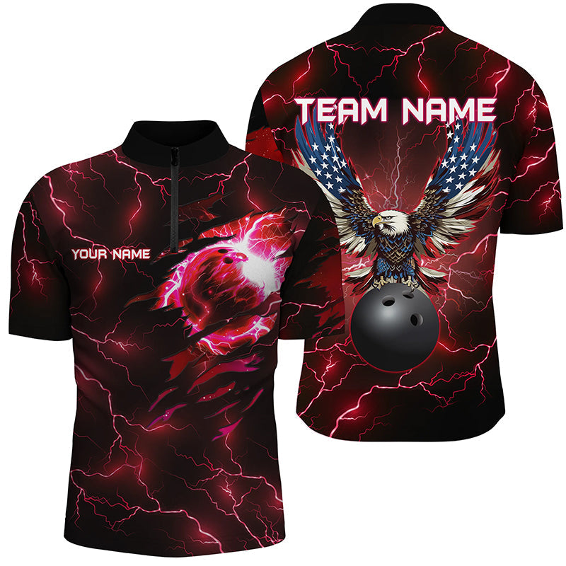 Red lightning thunder bowling American flag Eagle custom Mens Bowling Polo Shirts, Quarter Zip Shirts NQS8861