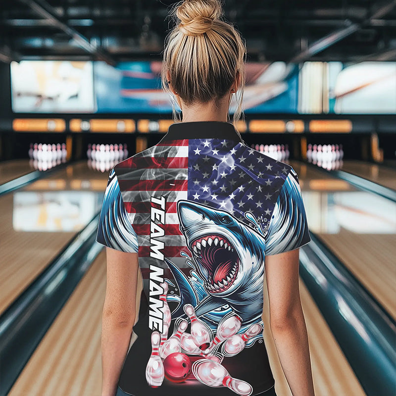 Smoke American Flag Shark Bowling Polo, 1/4 Zip Shirts for Women Custom patriotic Team Bowling jerseys NQS9671