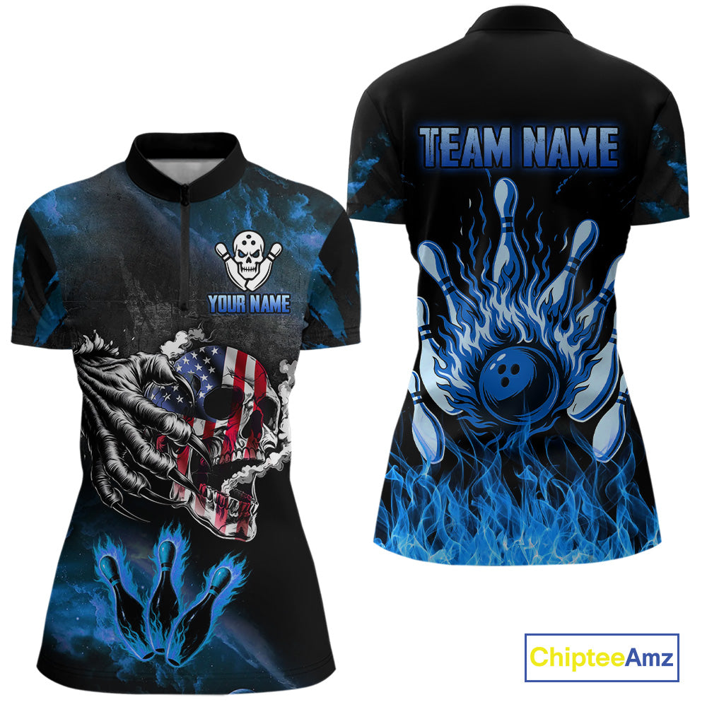 Blue Flaming American Flag Skull Bowling Shirt For Women Custom Fire Bowling Team Jersey TDM4692