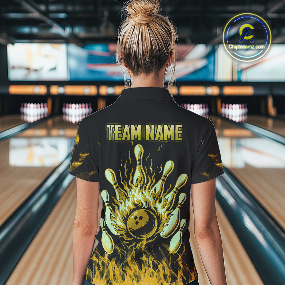 Yellow Flaming American Flag Skull Bowling Shirt For Women Custom Fire Bowling Team Jersey TDM4694