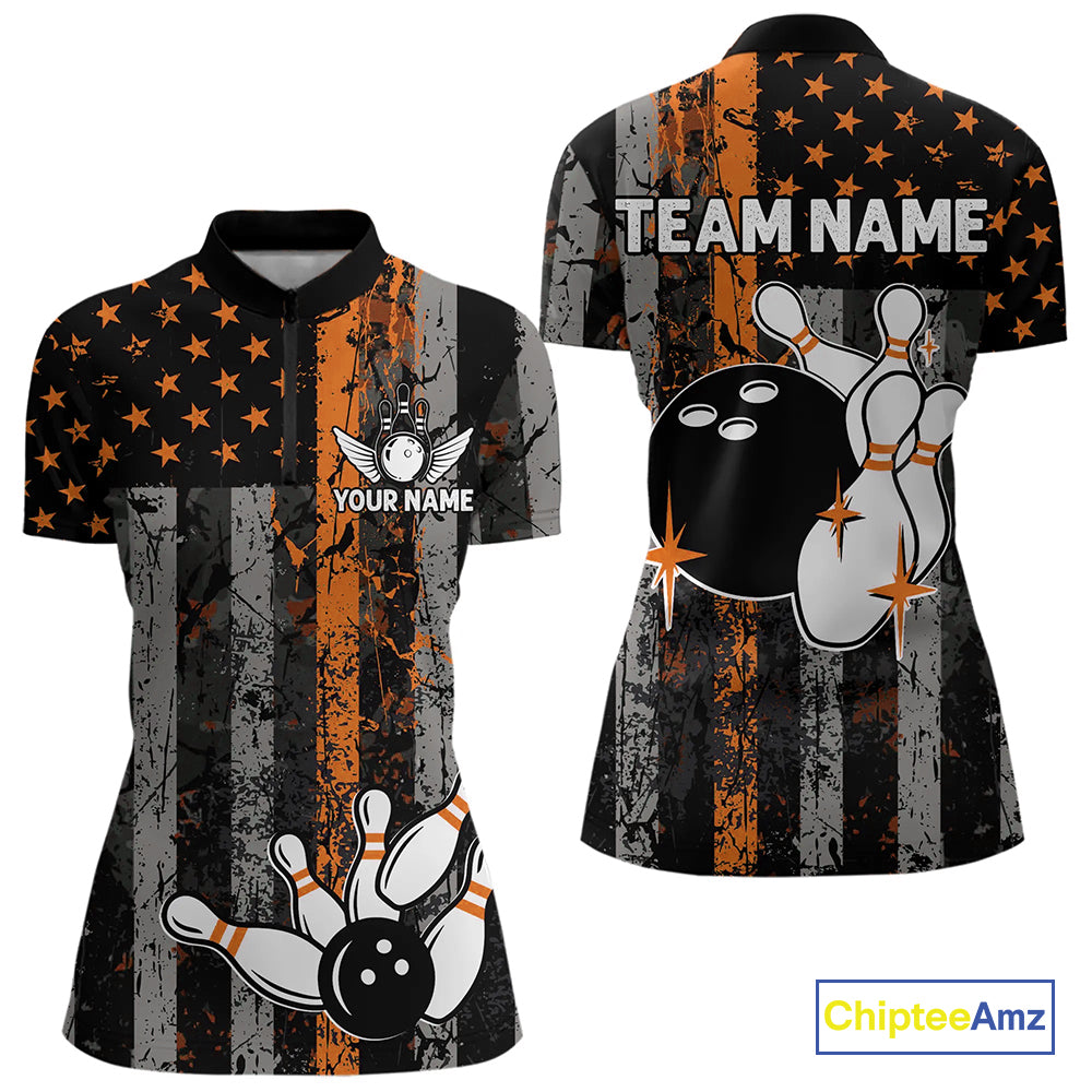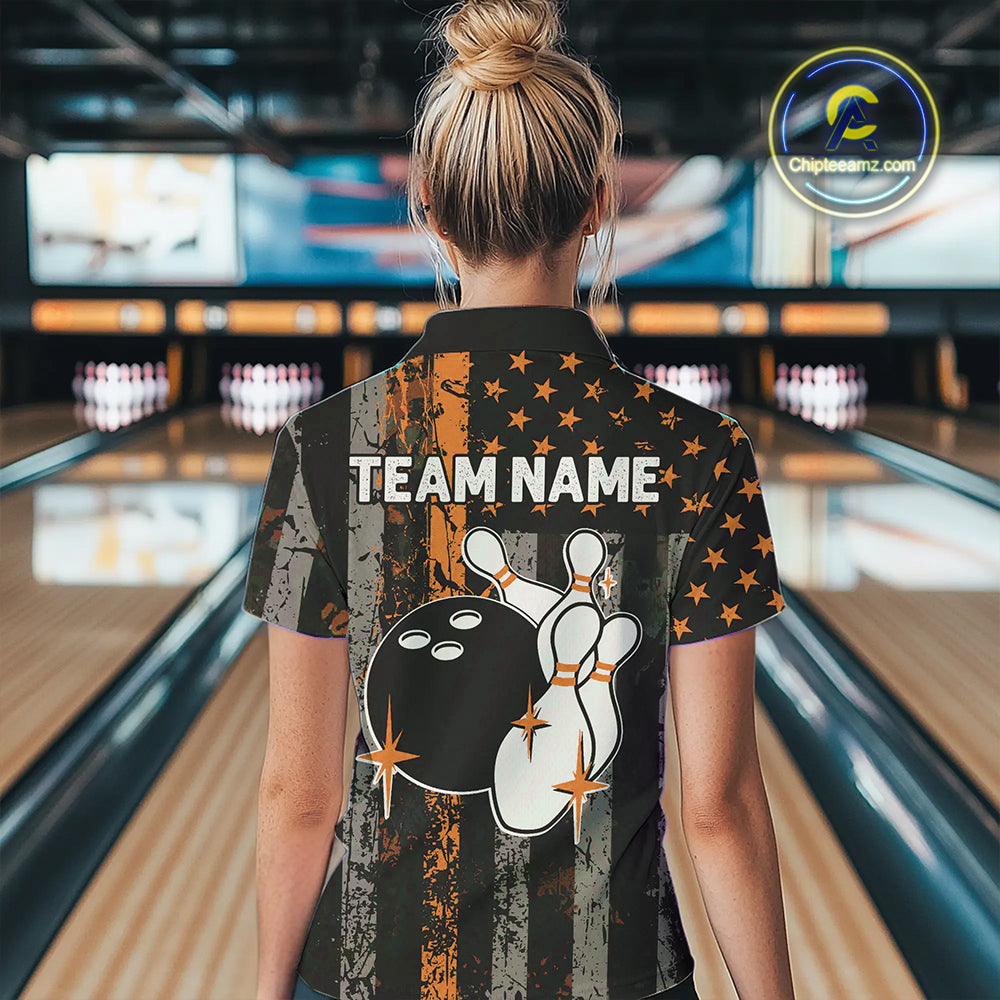 Orange Grunge American Flag Patriotic Bowling Shirts For Women Custom Bowling Team Jerseys TDM4852