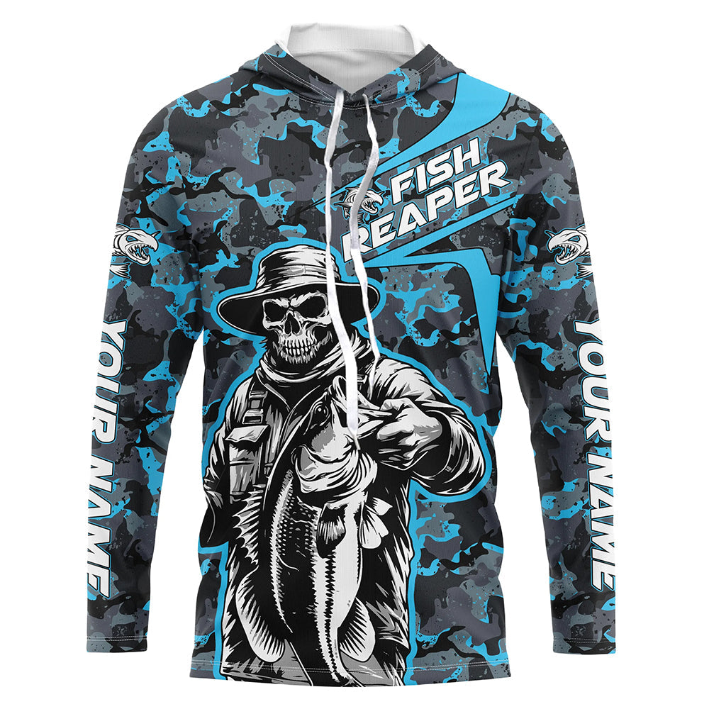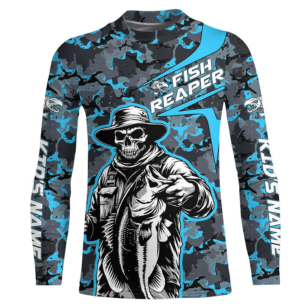 Custom Fish Reaper Skull Bass Long Sleeve Fishing Shirt, Bass Hunter Blue Camo Fishing Jerseys IPHW5638