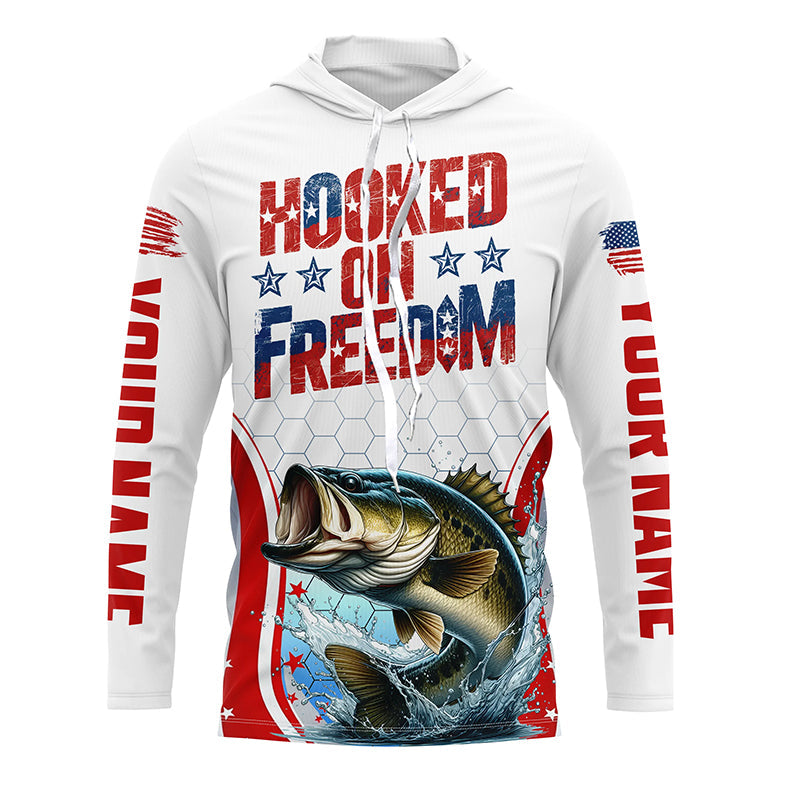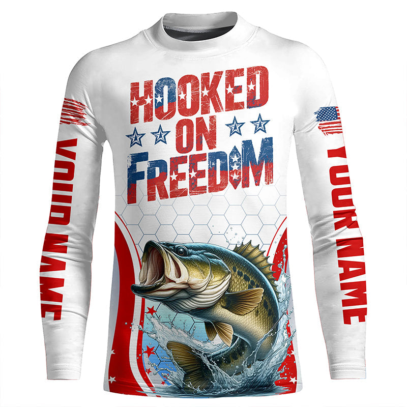 American Flag Bass Custom Long Sleeve Fishing Shirts, Hooked On Freedom Patriotic Fishing Jerseys IPHW6812