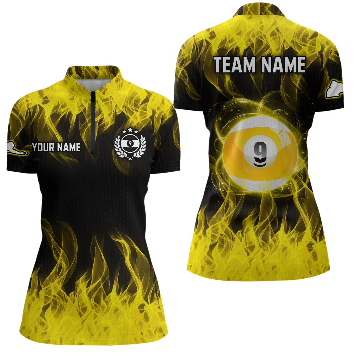 Personalized Yellow Flaming Billiard Jerseys 9 Ball Pool Billiard Shirts for Women Team Polo & 1/4 Zip Shirt NNT32