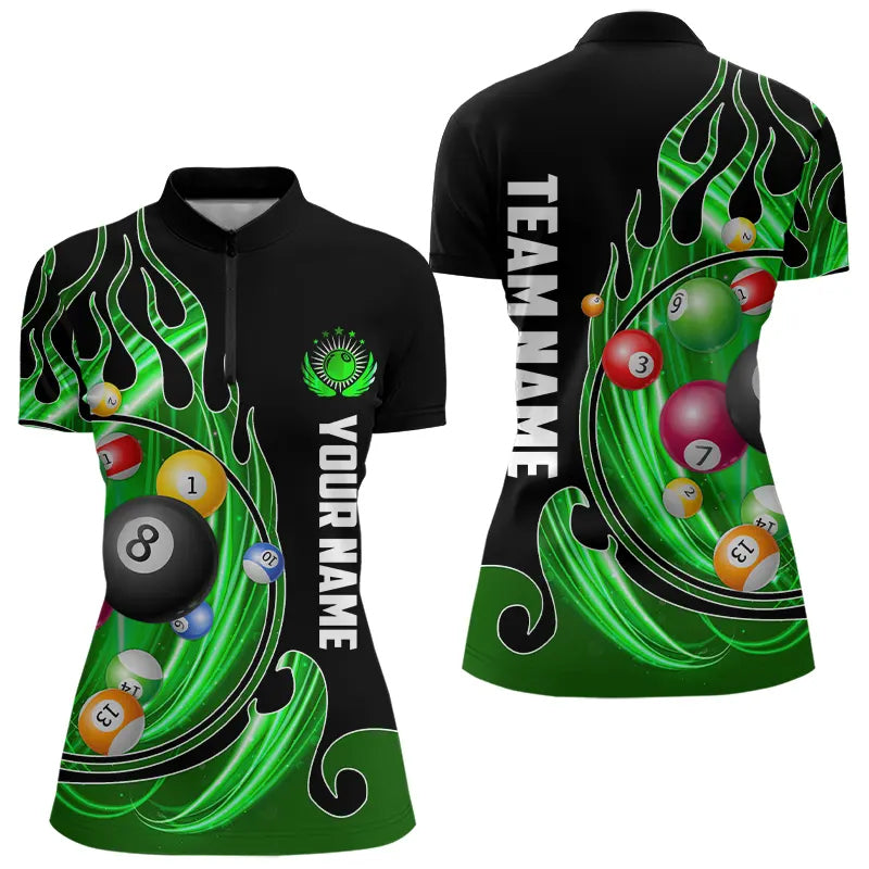 3D Billiard Balls Fire Flame Custom Pool Shirts For Women, Billiard League Team Jerseys | Green TDM3754