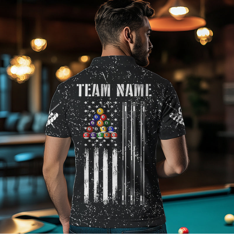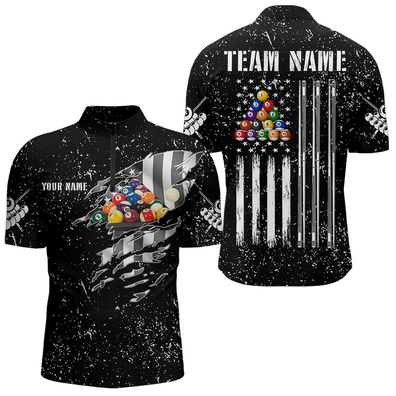 Personalized Black Grunge US Flag Billiard Balls Polo, 1/4 Zip For Men, 8 Ball Pool Billiard Jersey TDM3573
