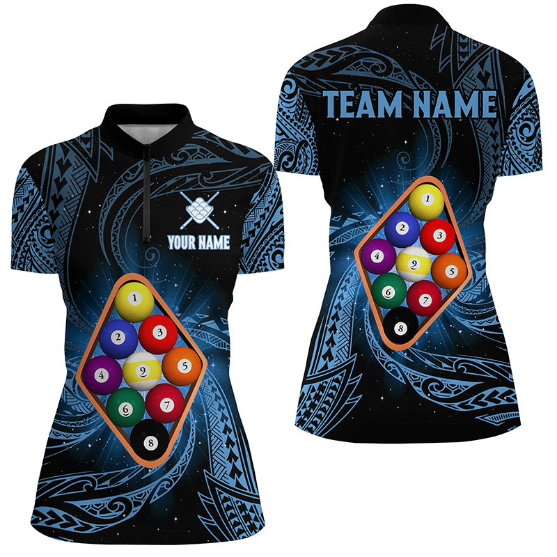 Personalized Blue Tribal Pattern 9 Ball Billiard Shirts For Women, 9 Ball Pool Billiard Jerseys TDM2234