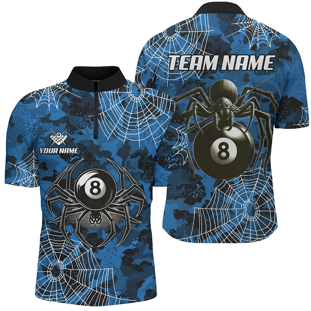 Blue Camo Billiard Spider Cobweb Custom Men Polo & Quarter-Zip Shirts, Unique 8 Ball Pool Jerseys TDM2459