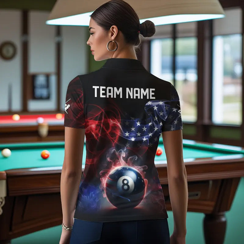 Custom American Flag Smoke 8 Ball Pool Billiard Polo & 1/4 Zip For Women, Patriotic Billiard Jerseys TDM3470