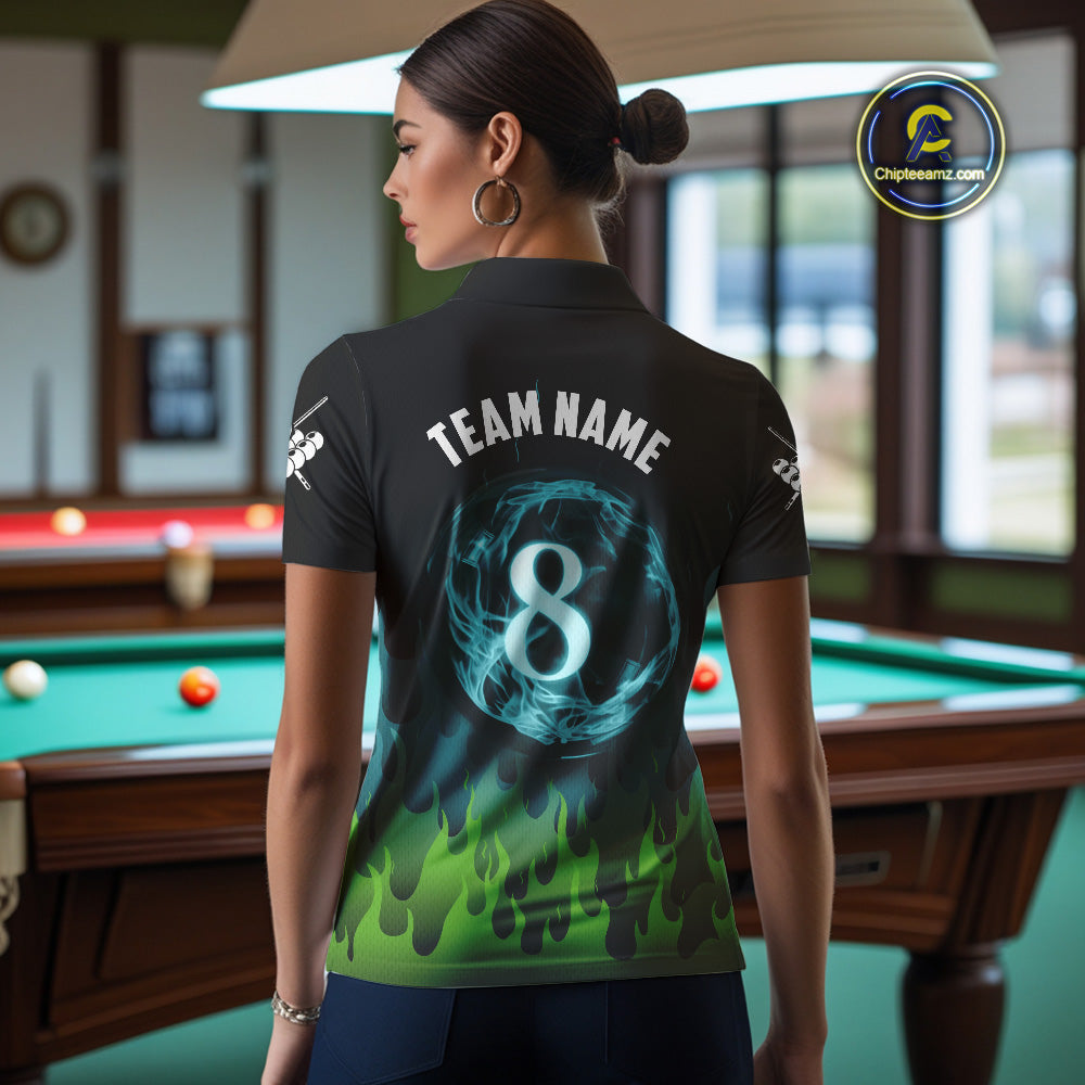 Green And Blue Flaming 8 Ball Pool Women Billiard Polo & 1/4 Zip Custom Pool Team Player Jersey TDM3828