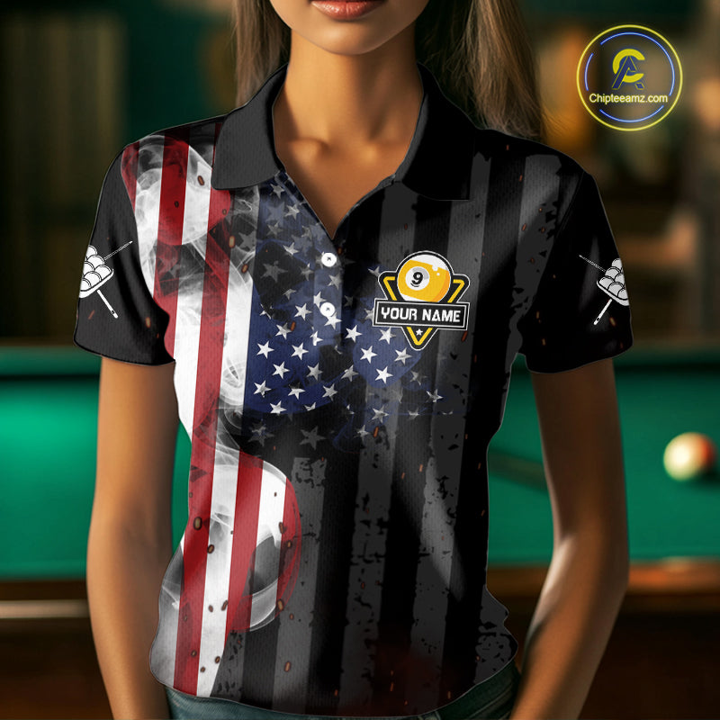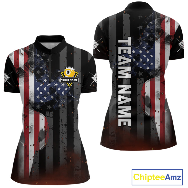 Personalized Vintage Smoke US Flag Billiard Shirts For Women, 9 Ball Pool Patriotic Billiard Jersey TDM4845