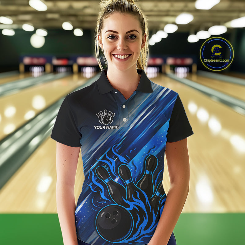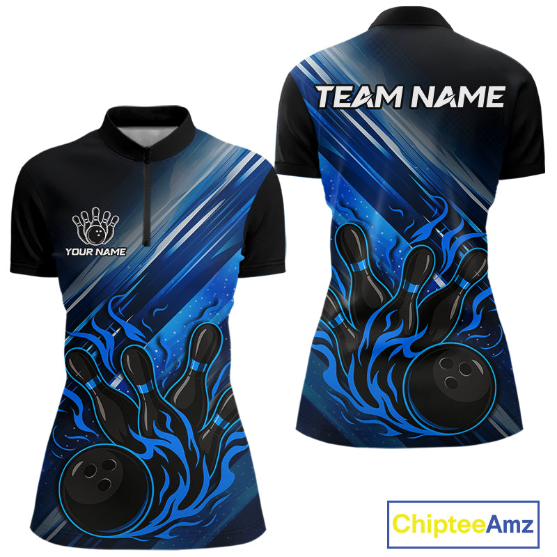 Black and Blue Flame Bowling Polo, Quarter Zip Shirt For Women Custom Team Ladies Bowling Jerseys NQS10099