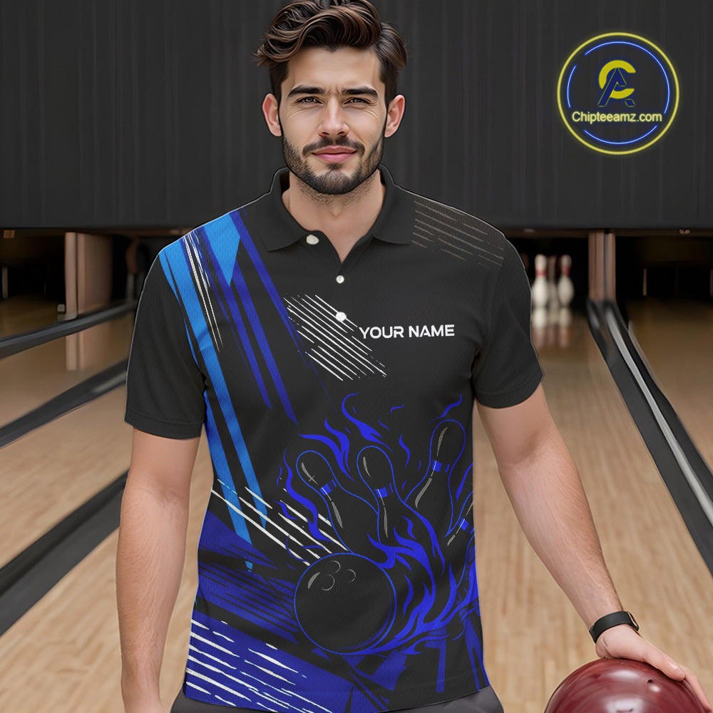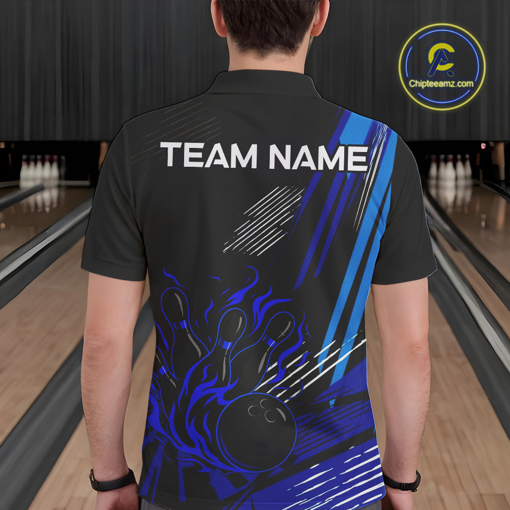 Black and Blue Flame Bowling Polo, Quarter Zip Shirts For Men Custom Bowling Outfit Team Jerseys NQS9962