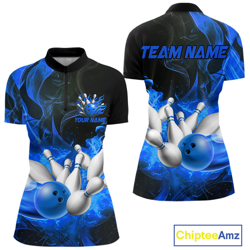 Black And Blue Flame Custom Bowling Shirts For Women, Flame Bowling League Shirts Outfits NQS9808