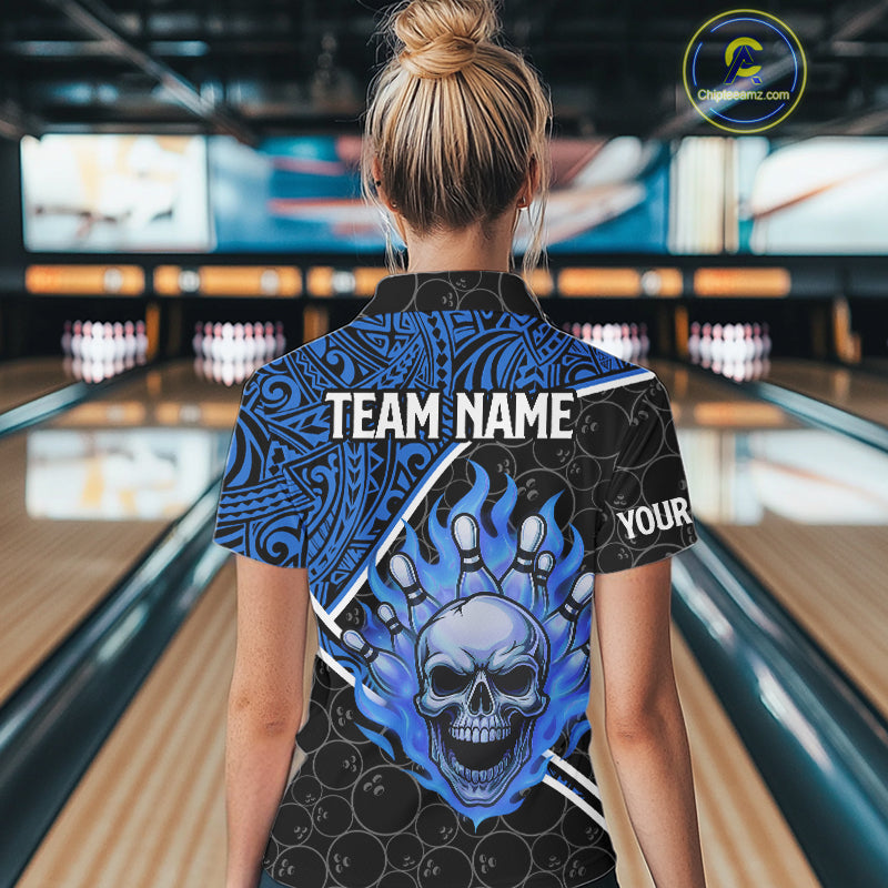 Black and Blue Flame Skull tribal pattern camo Bowling Shirts for Women Custom Bowling Team Jersey NQS10916