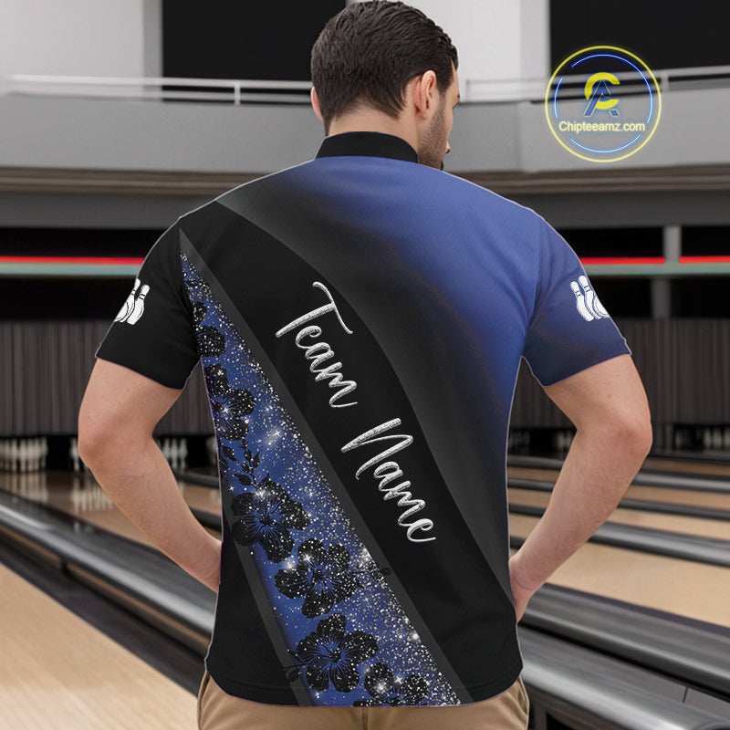 Black and Blue Glitter Flower Bowling Polo, Quarter Zip Shirt for Men Custom Bowling Team Jerseys NQS10383