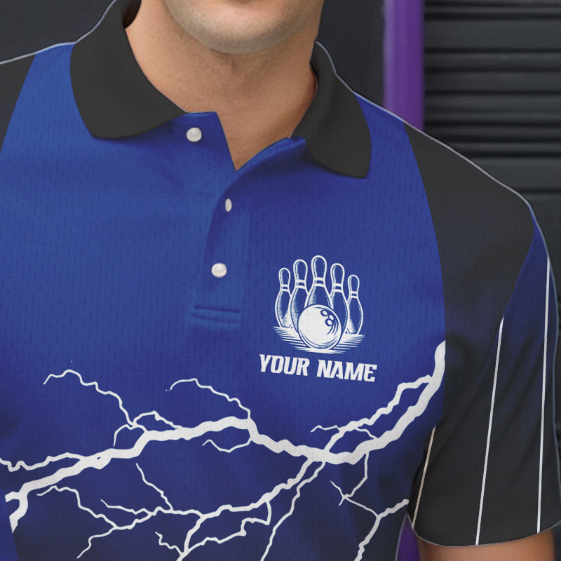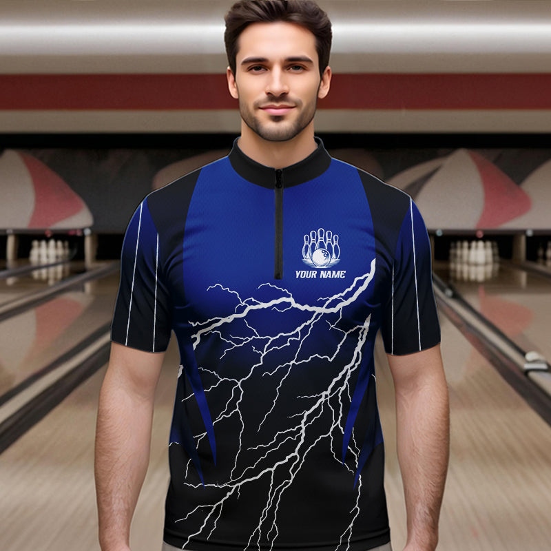 Black and Blue Lightning thunder Bowling Polo, Quarter Zip shirts for Men Custom Bowling Team Jerseys NQS9346