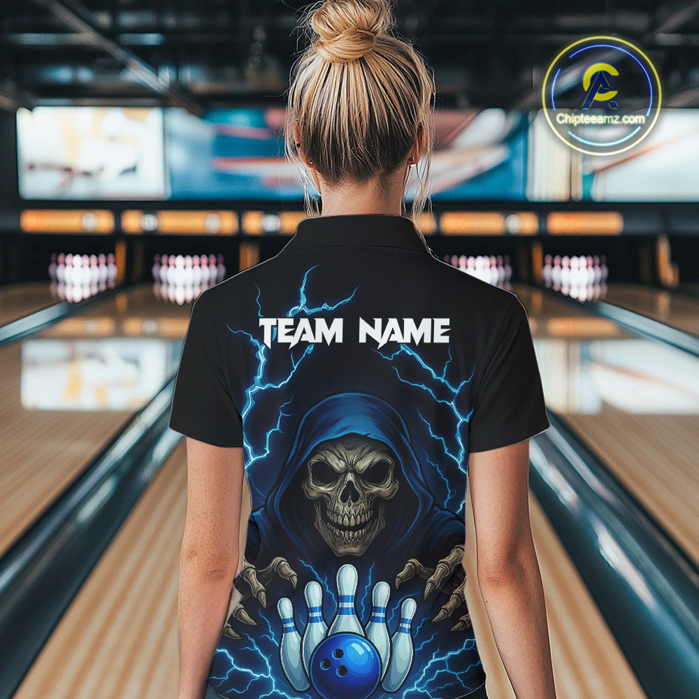 Black and Blue Lightning Thunder Reaper Skull Women Bowling Shirts Custom Bowling Team League Jersey NQS10728