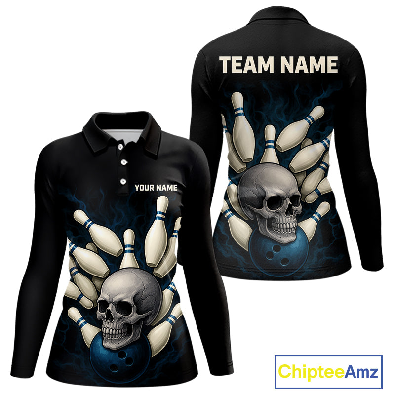Black and Blue Skull Bowling Ball and Pins Bowling Shirts For Women Custom skull team bowling jerseys NQS9850