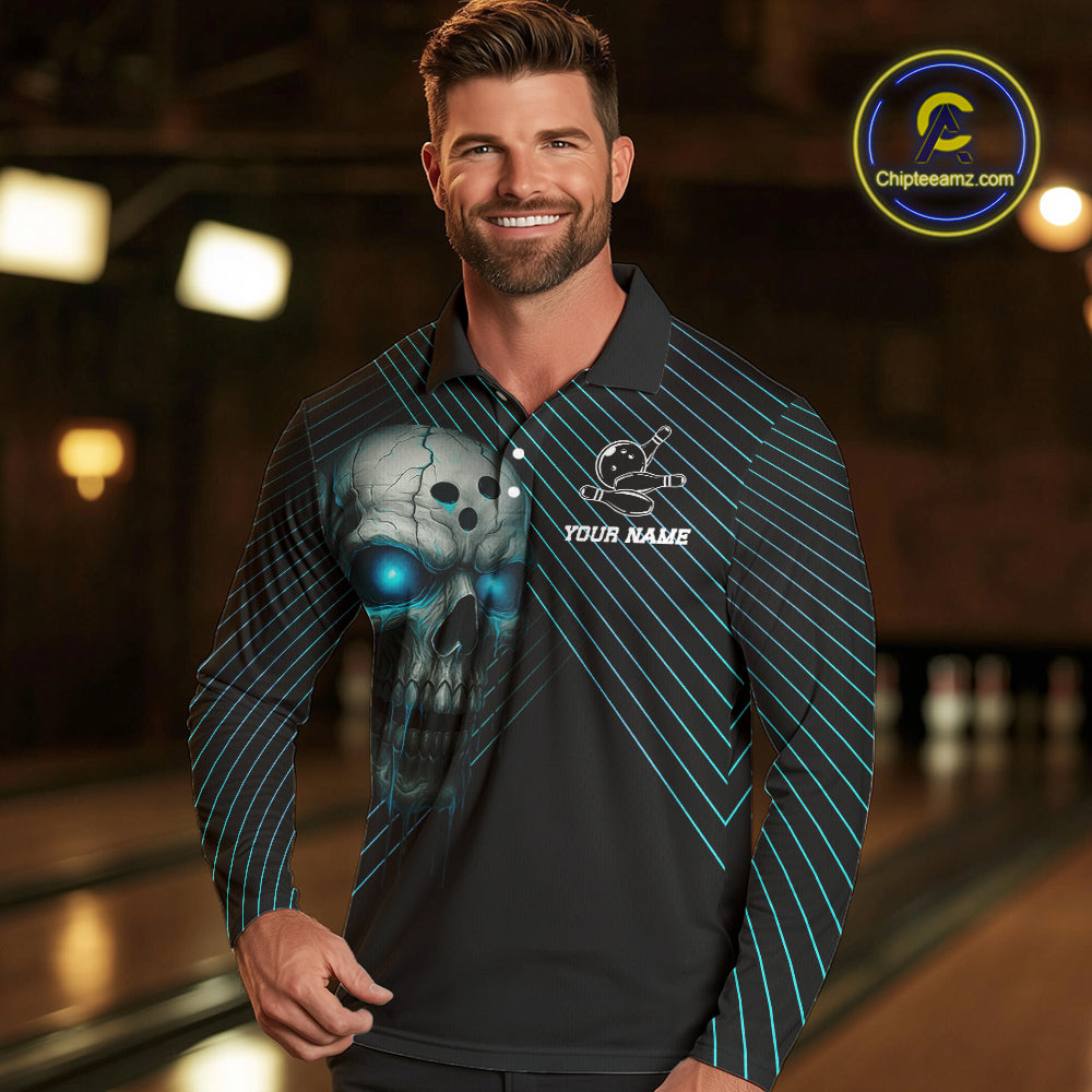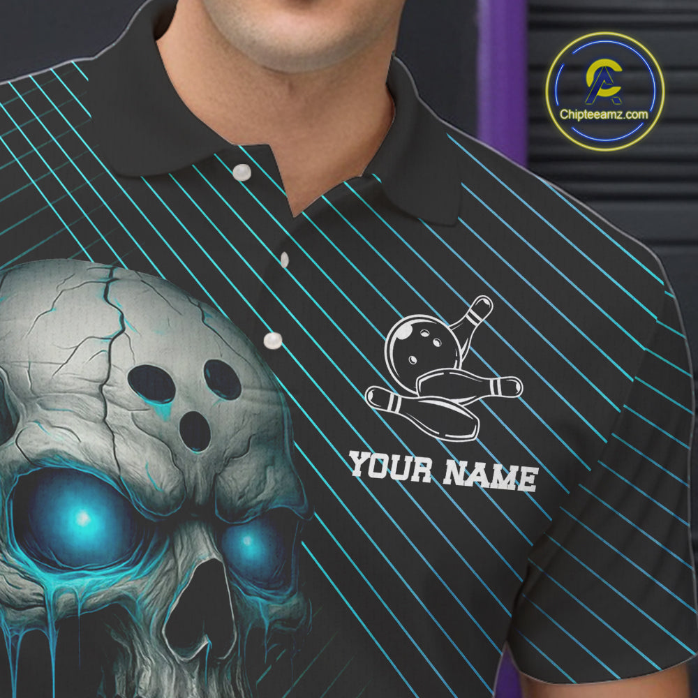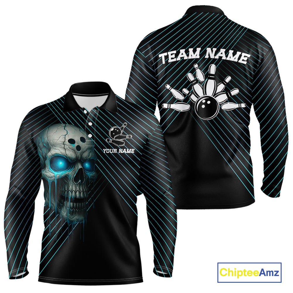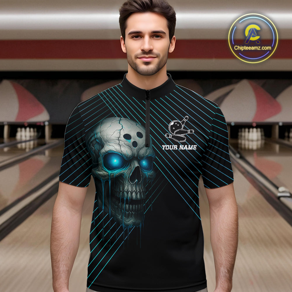 Black and Blue Skull Bowling Polo, Quarter Zip Shirts For Men Custom Bowling Team Jerseys Outfits NQS10171