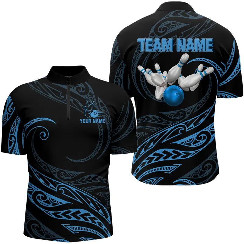 Black and Blue Tribal Pattern Bowling Polo, Quarter Zip shirts For Men Custom Team Bowling Jerseys NQS9213