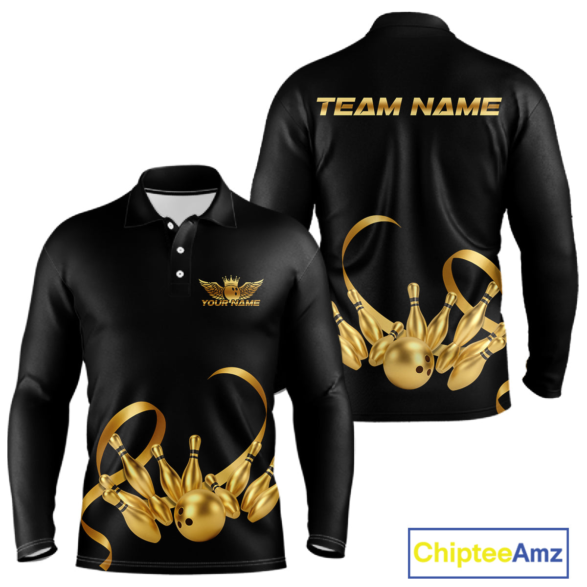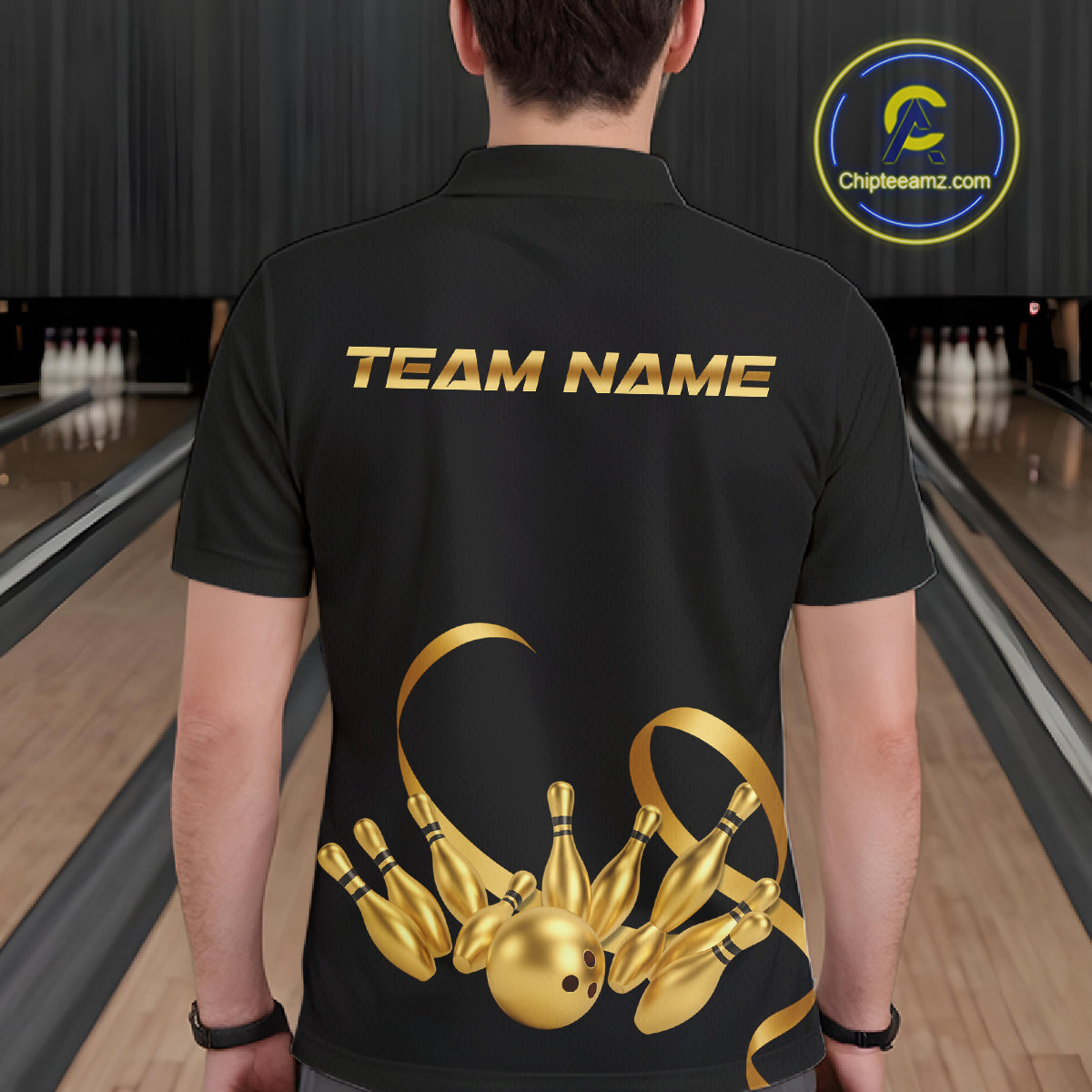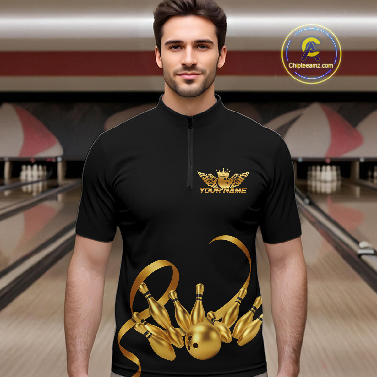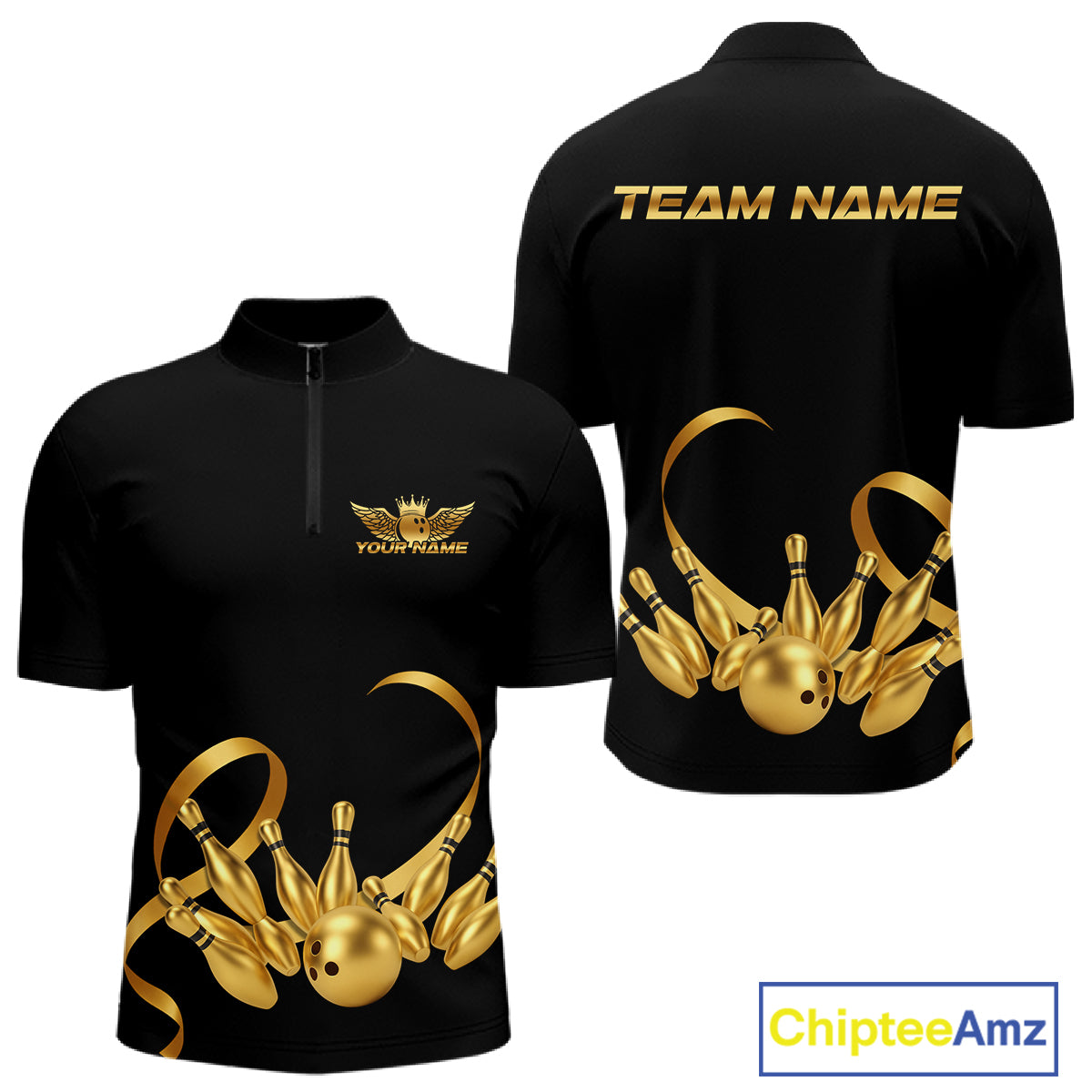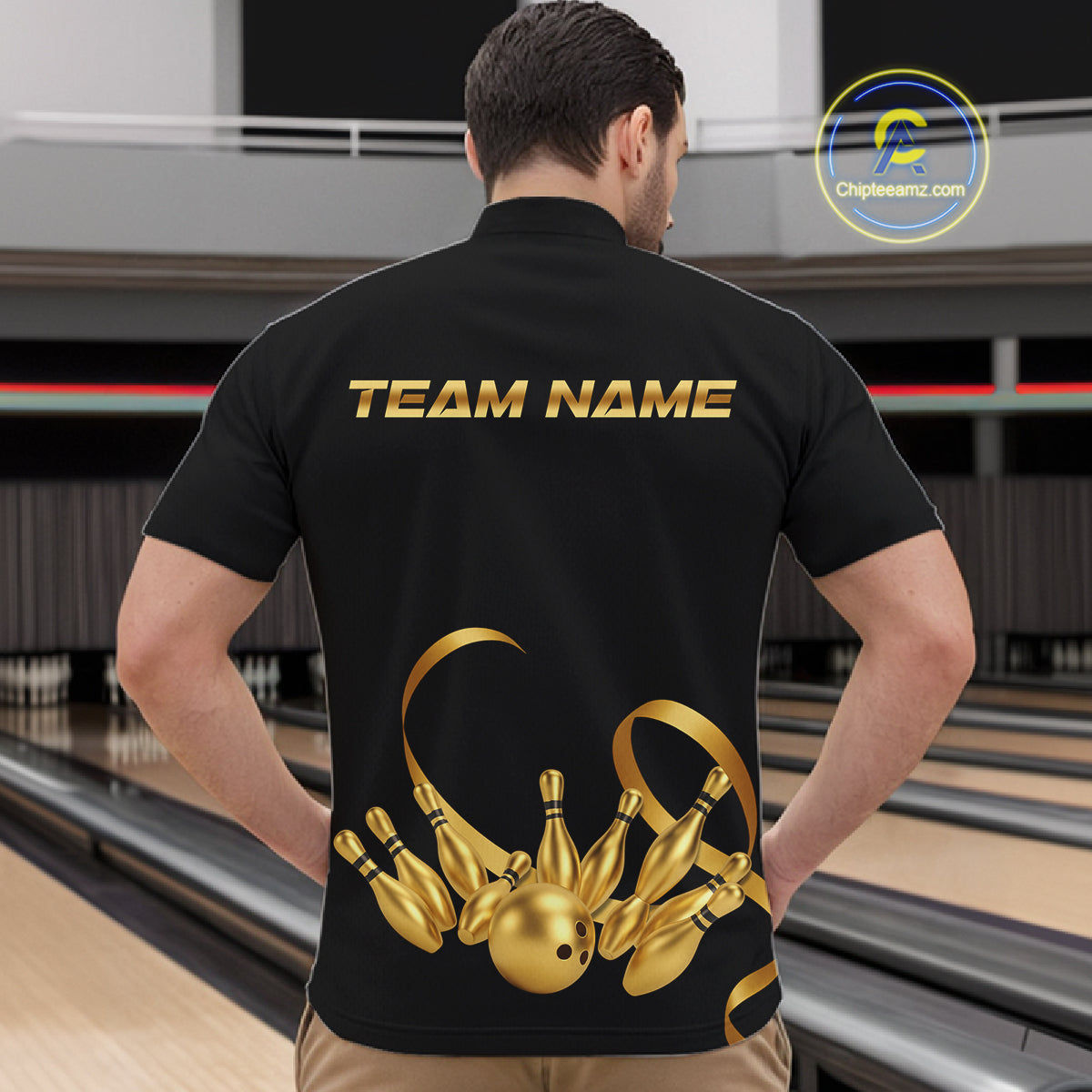 Black and Gold Ribbon Bowling Polo, 1/4 Zip Shirts For Men Custom Breast Cancer Bowling Team Shirt NQS10465