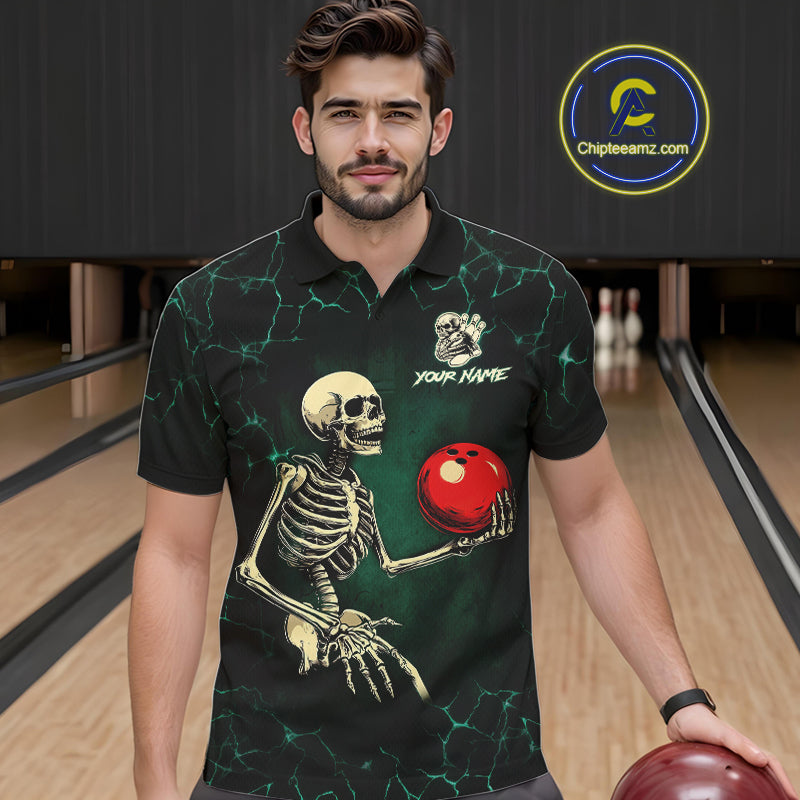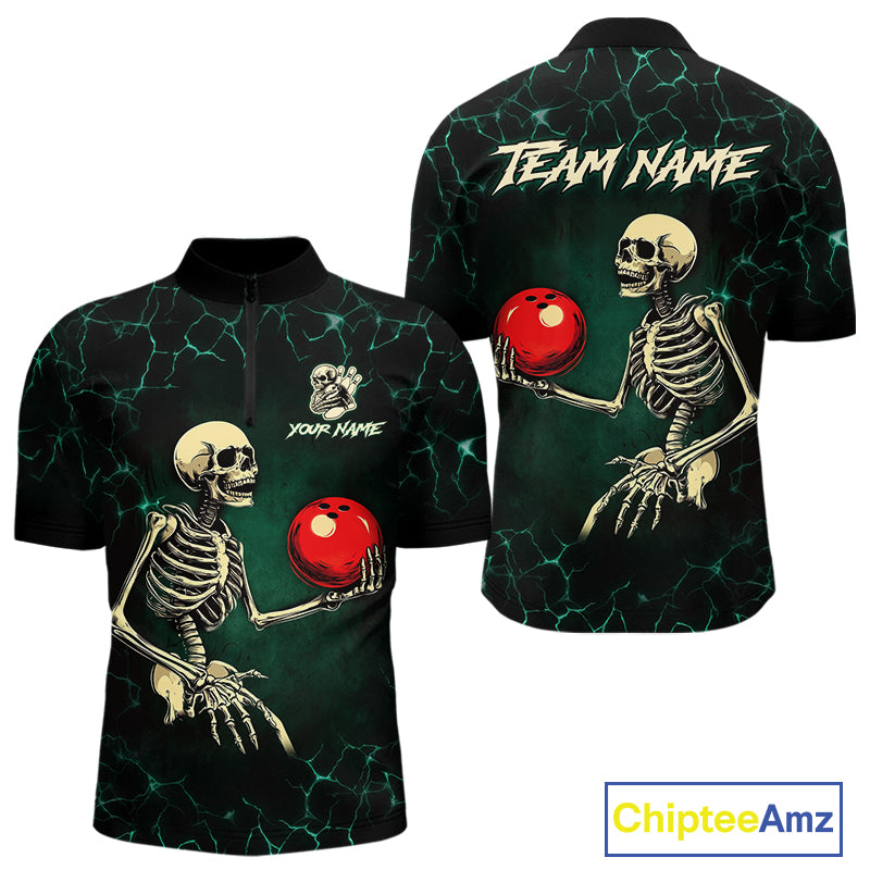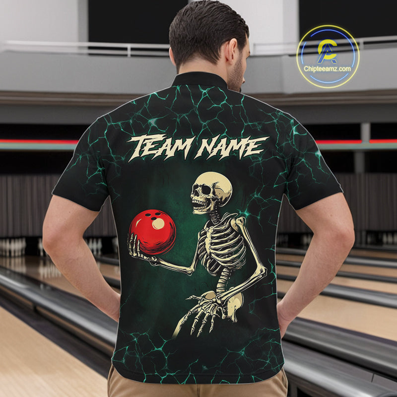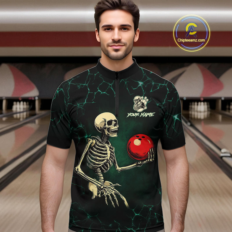 Black and Green Lightning Skull Bowling Polo, Quarter zip shirts For Men Custom Bowling Team Outfit NQS10921