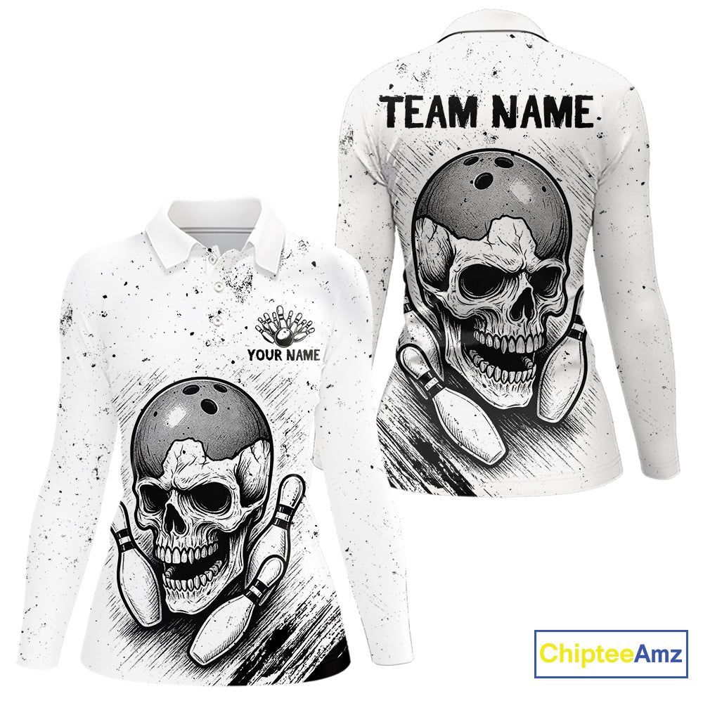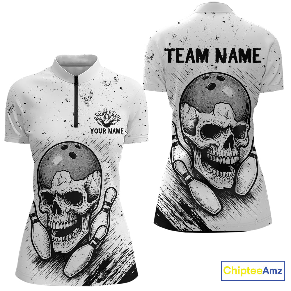 Black and White Grunge Skull Bowling Polo, 1/4 Zip Shirts For Women Custom Skull team bowling jerseys NQS9854