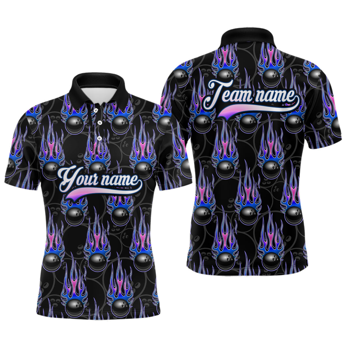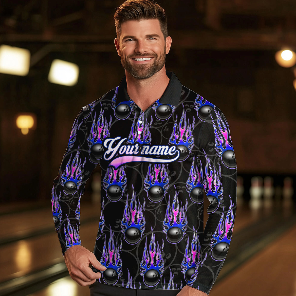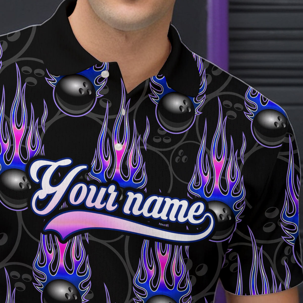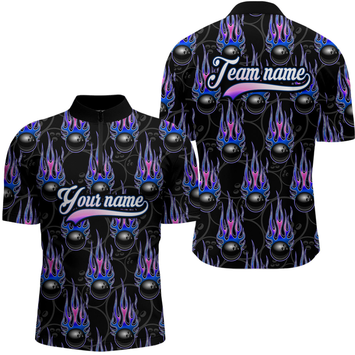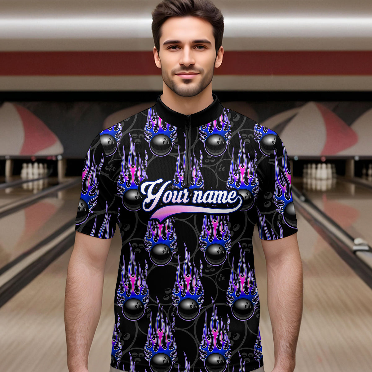 Black Bowling Ball Camo Blue Flame Bowling Polo, 1/4 Zip Shirt for Men Custom Bowling Team Jersey NQS9480
