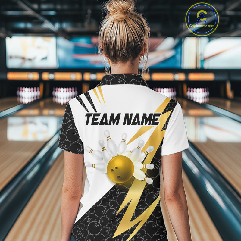 Black & White Bowling Polo, Quarter Zip Shirt for Women Custom Lightning Team bowling jersey | Gold NQS10004